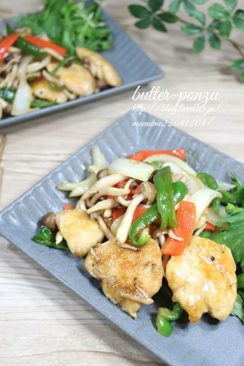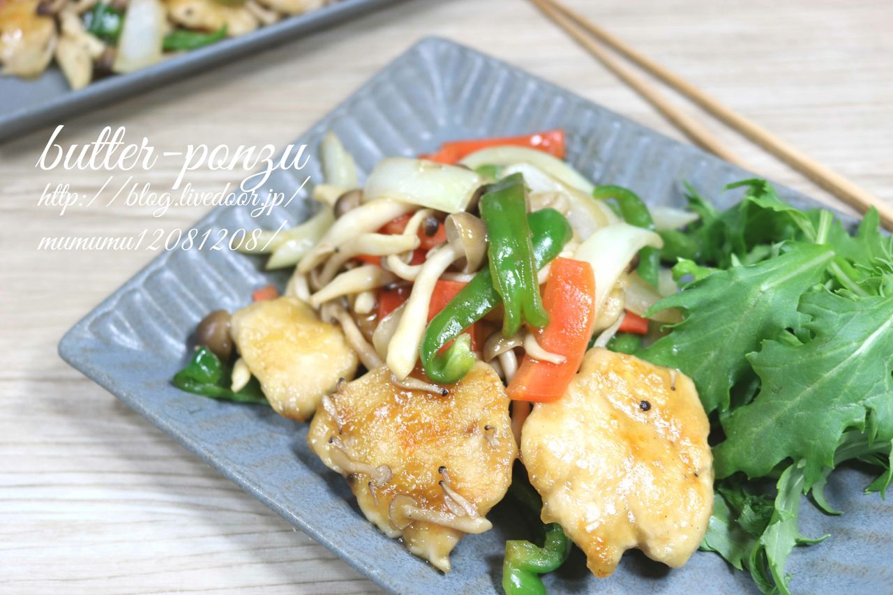 柔らか鶏むね肉としめじのバタポン炒め。