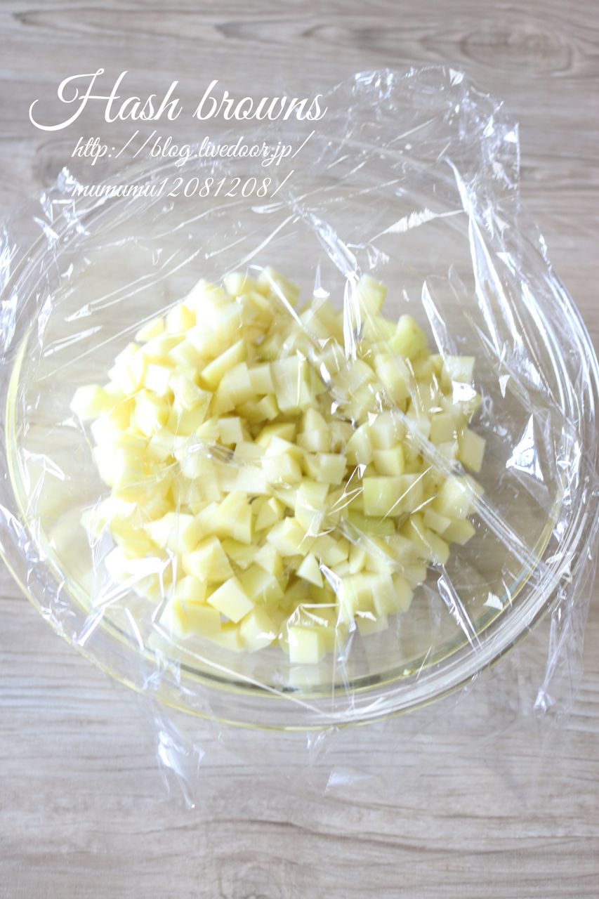 ②ボウルにじゃがいもを入れて、水を加えてふんわりラップをして600Wの9分位チンをする。