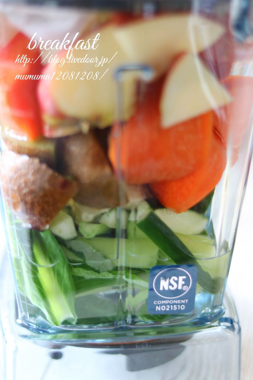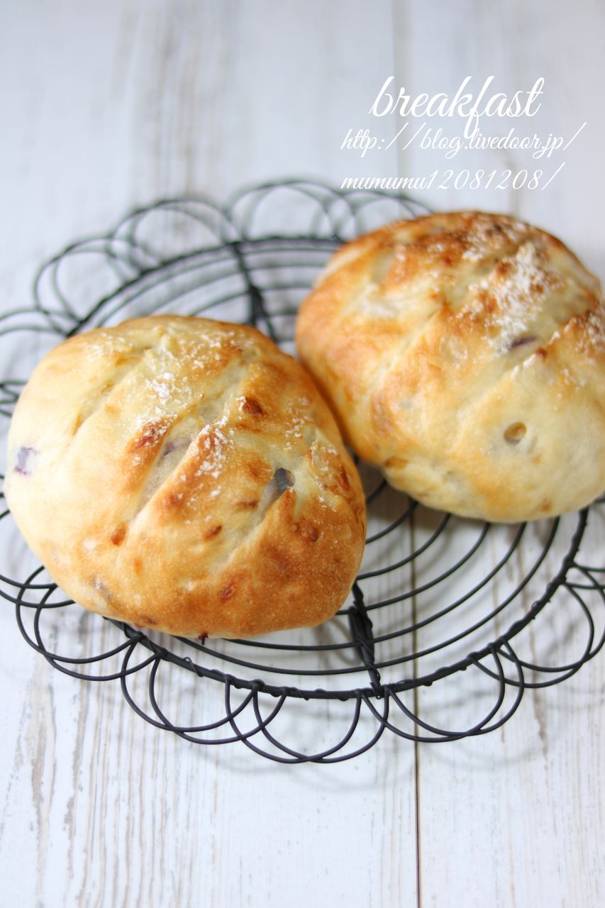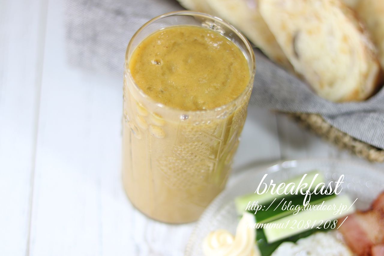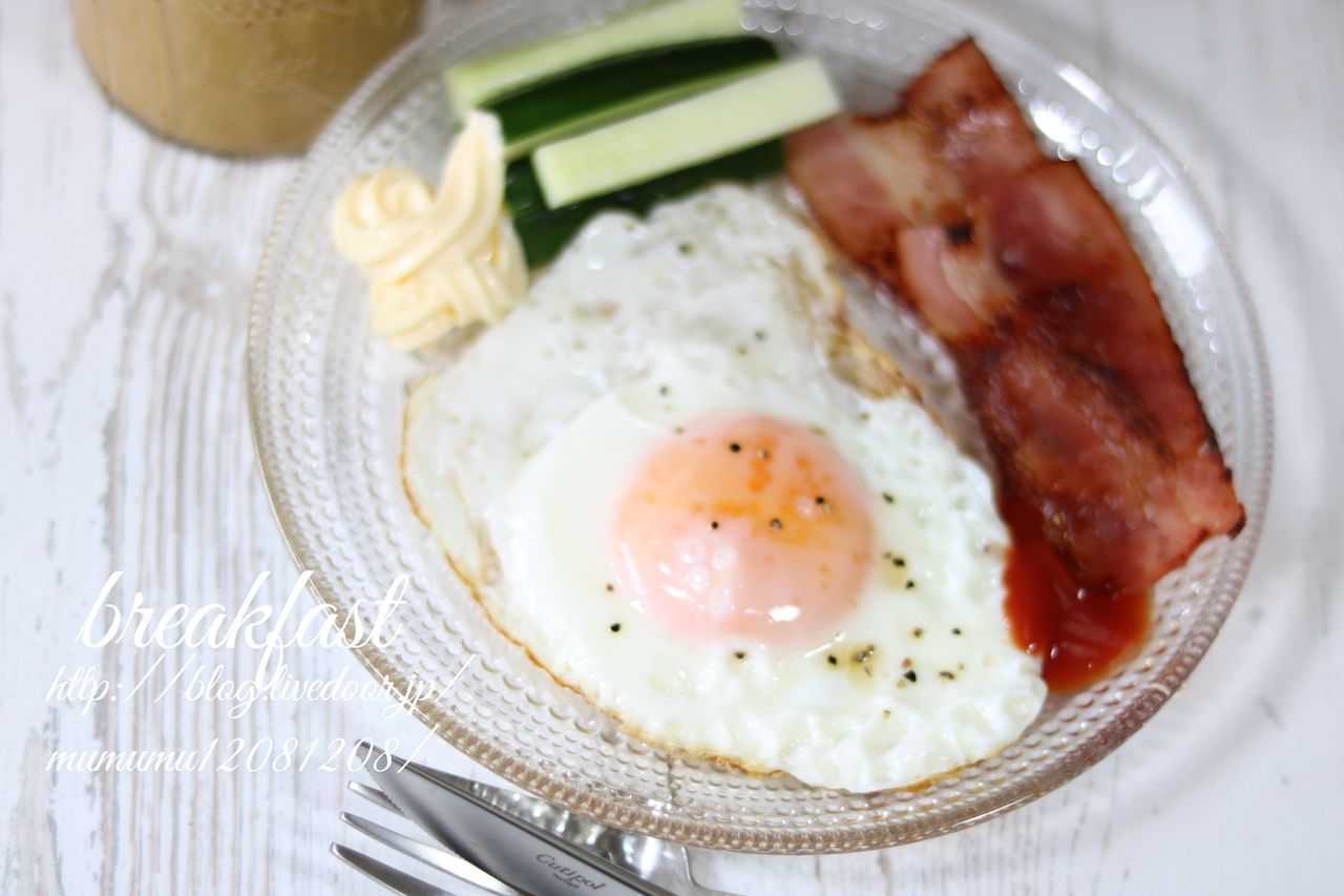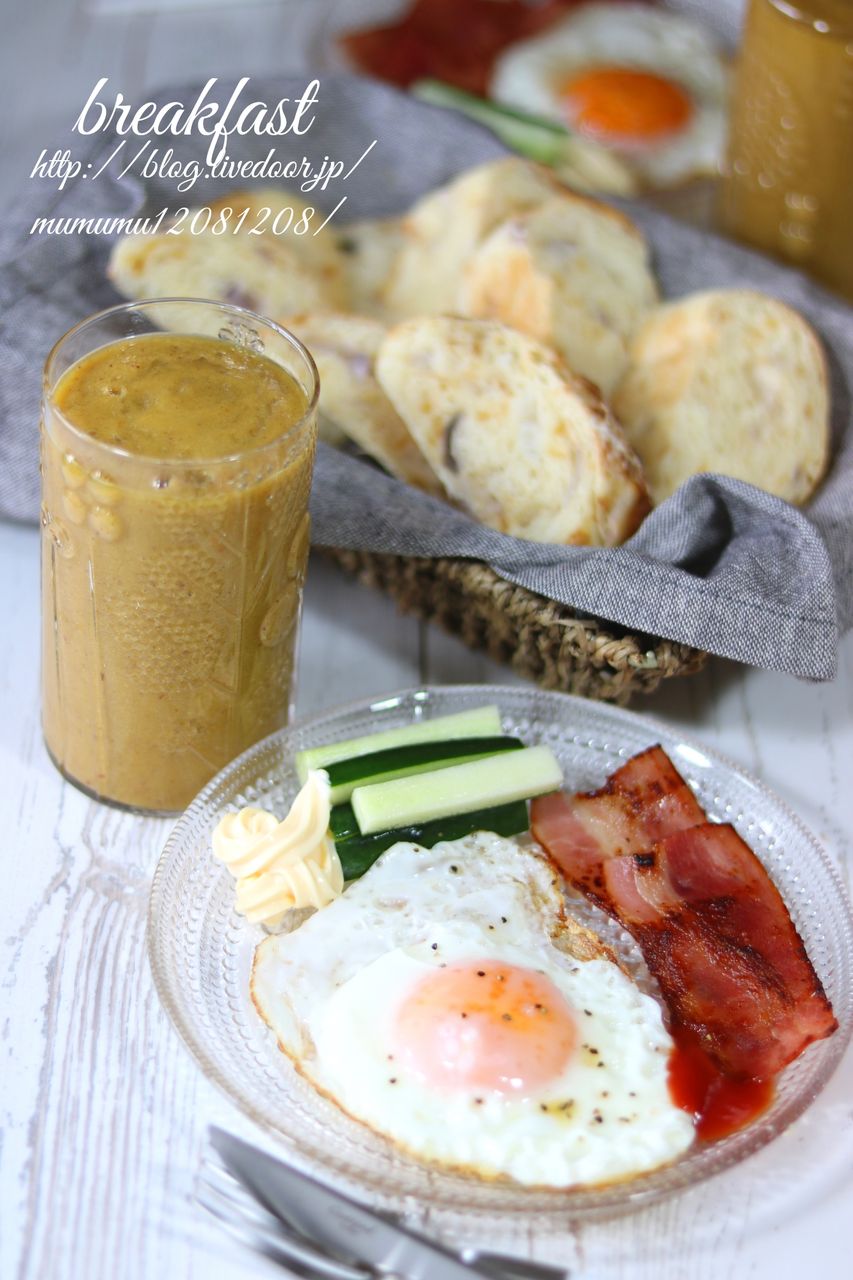 目玉焼き・焼きベーコン・きゅうり・スムージー・玉ねぎパン。