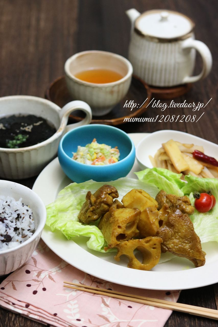 鶏肉と蓮根のカレー照り煮・コールスロー・蓮根のきんぴら・海苔のスープ・香ばし五穀ご飯。