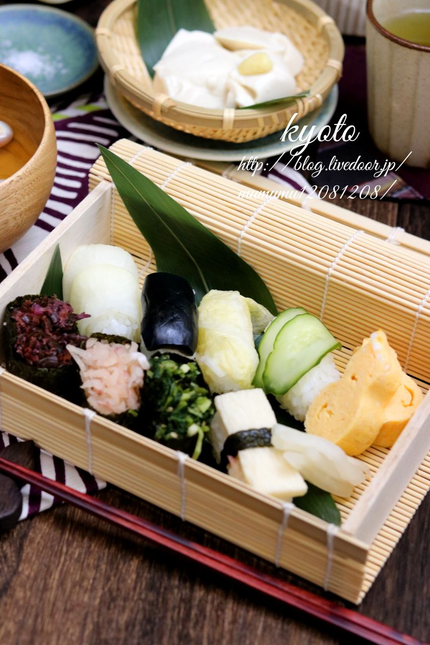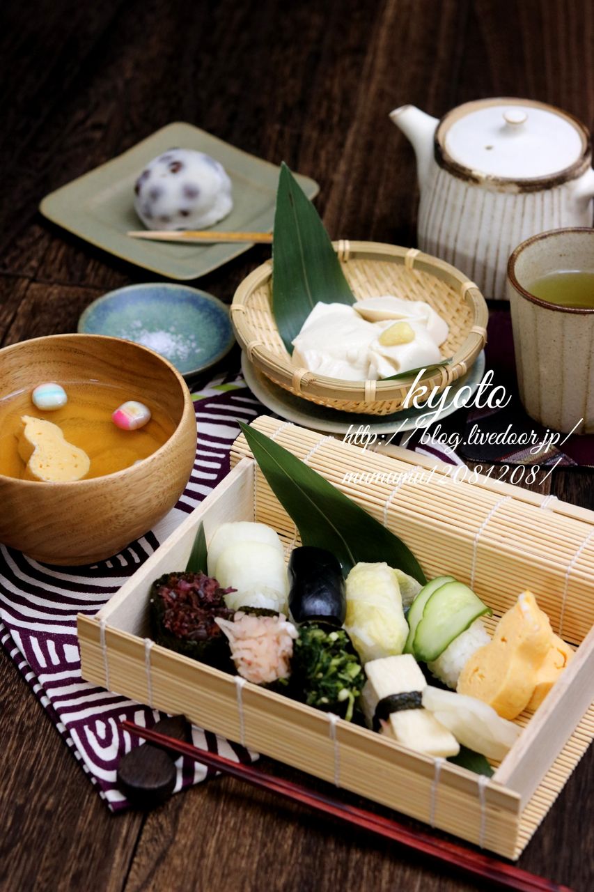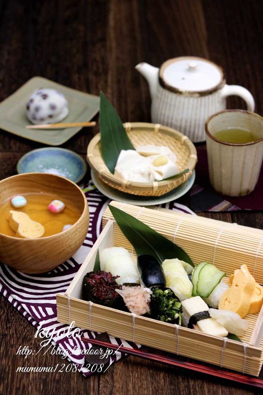 お漬物で有名な西利さんの漬物寿司・出汁巻きたまごのお吸い物・ざる豆腐に見せかけたケンちゃん豆腐・豆大福・緑茶。