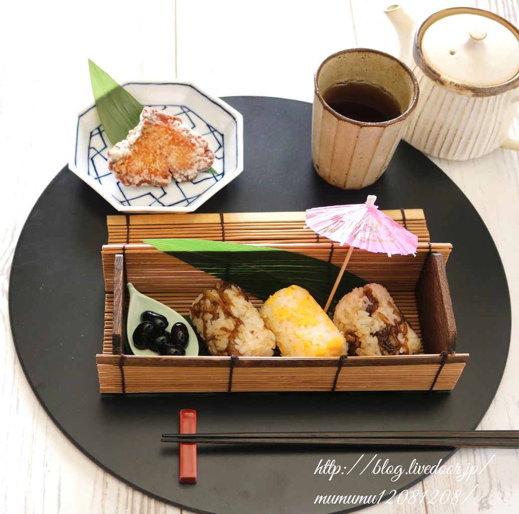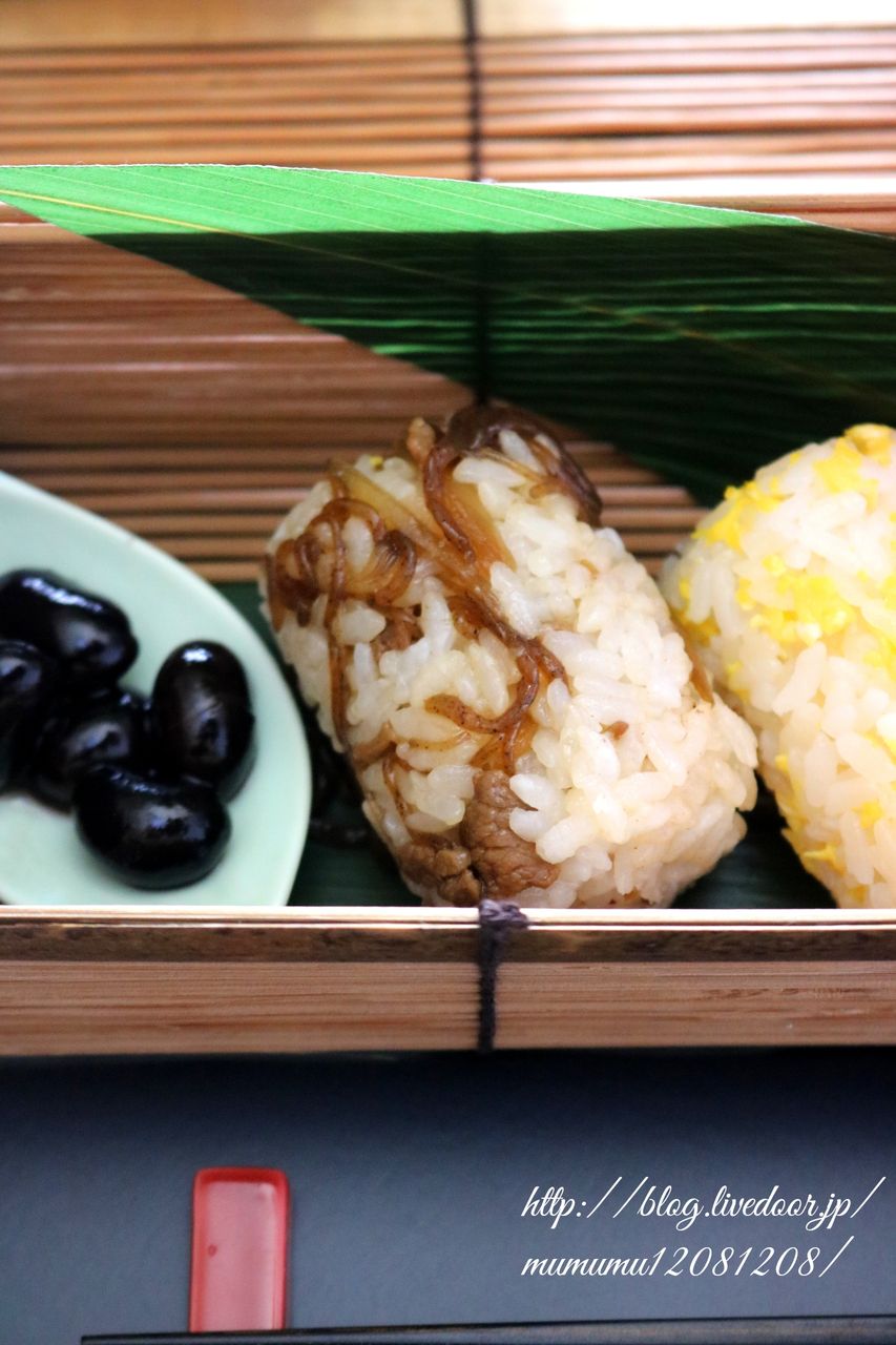 牛肉のしぐれ煮でおにぎり・炒りたまごおにぎり・鰤のピリ辛揚げ・黒豆。