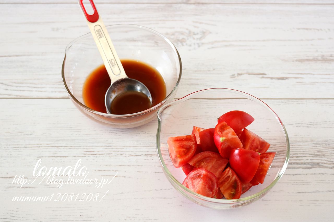 ①トマトは綺麗に洗ってヘタを取り、乱切りにする。