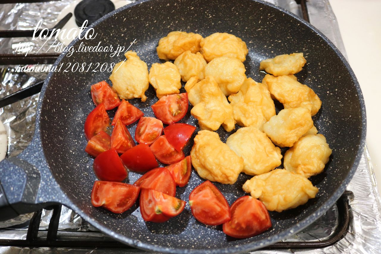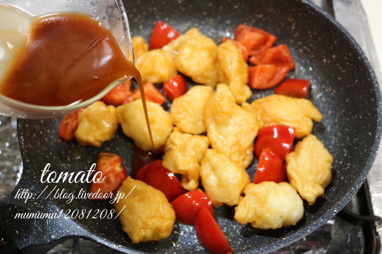 ④フライパンにごま油を入れて熱し、上げたイカ団子とトマトを入れてサッと炒める。