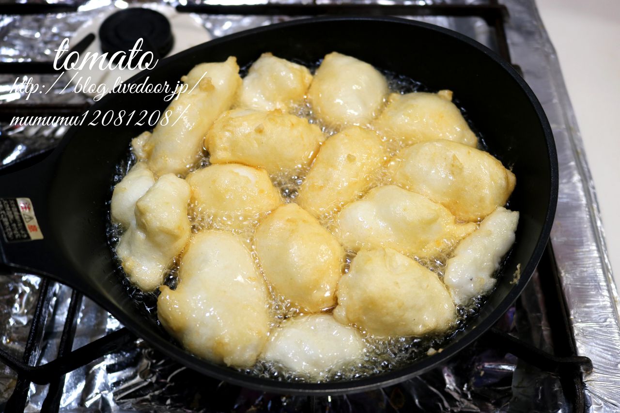 ③フライパンにサラダ油を入れて熱し、一口大に丸めたイカのタネを入れてきつね色になるまで揚げる。