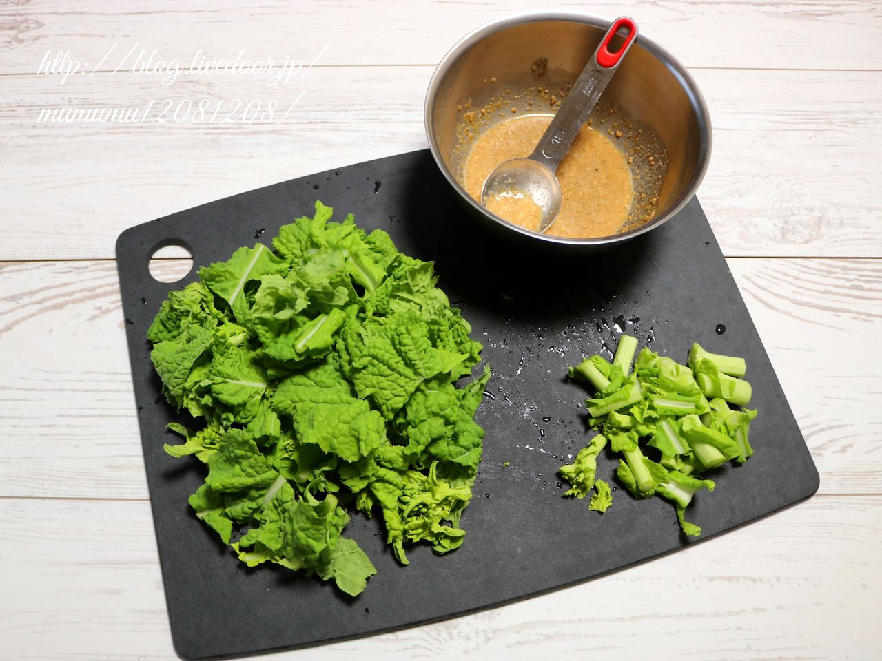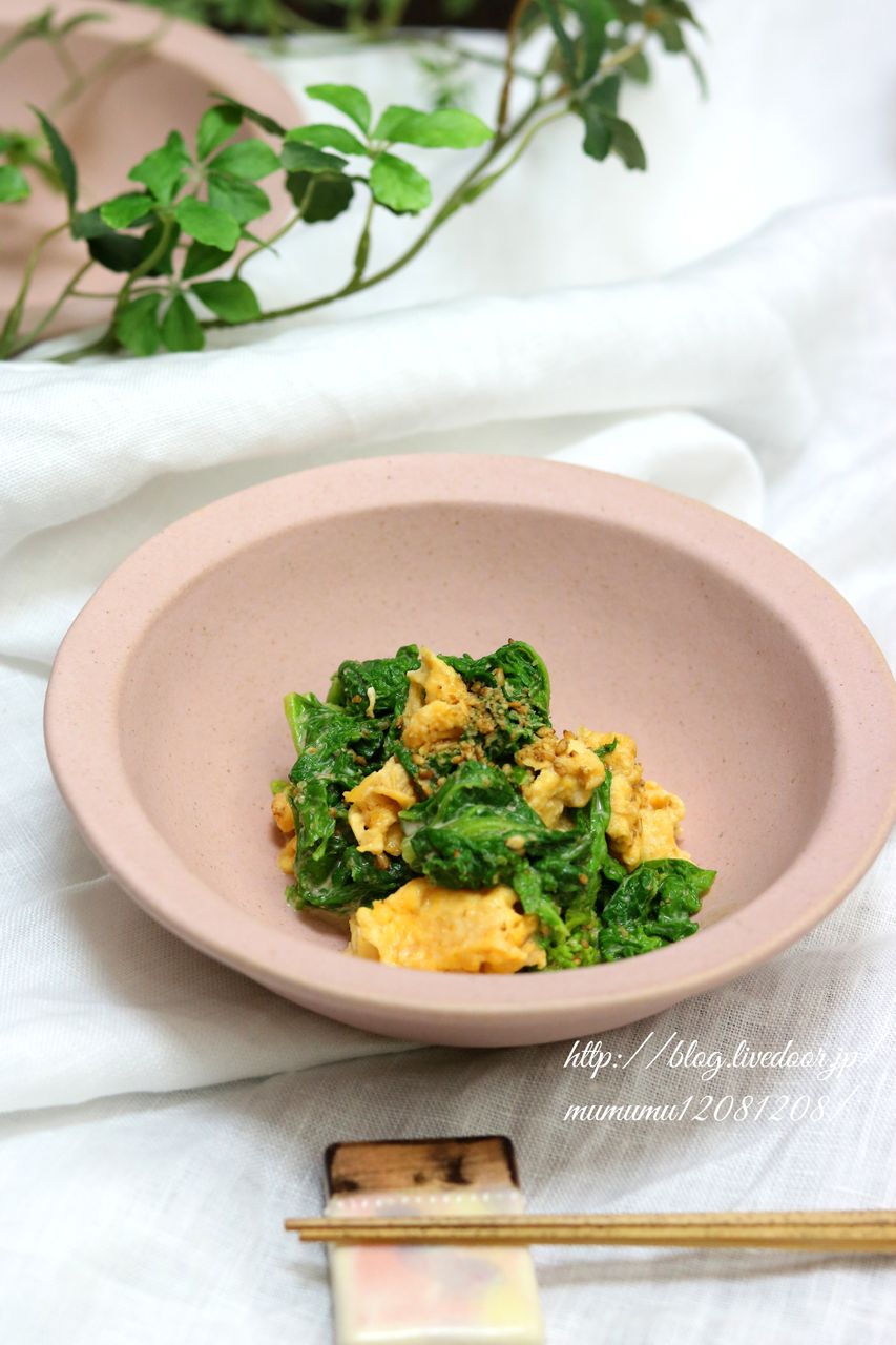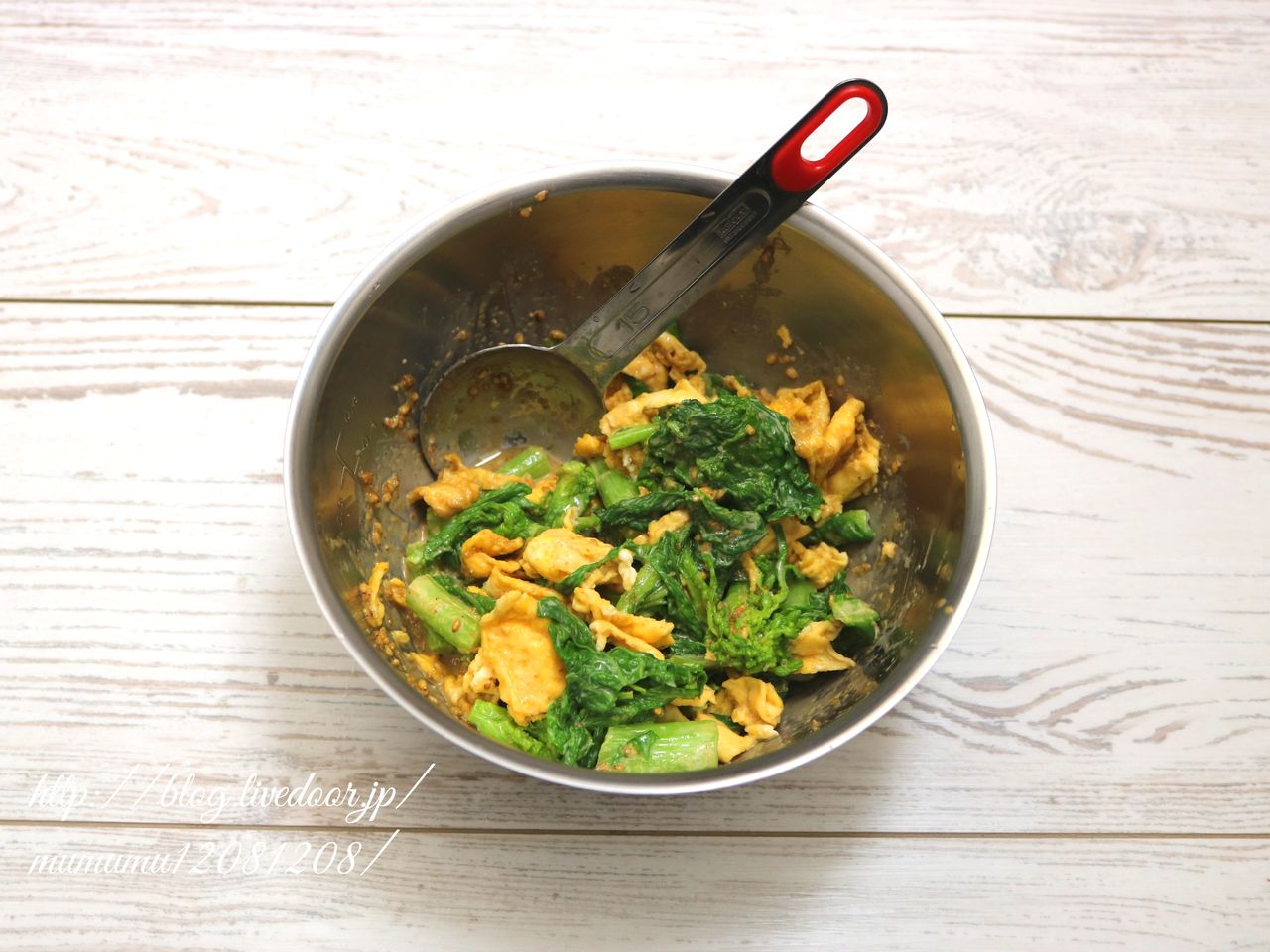 ⑦合わせておいた◎のボウルに炒りたまごと水気をしっかりと絞った菜の花を入れてサッと和える。
