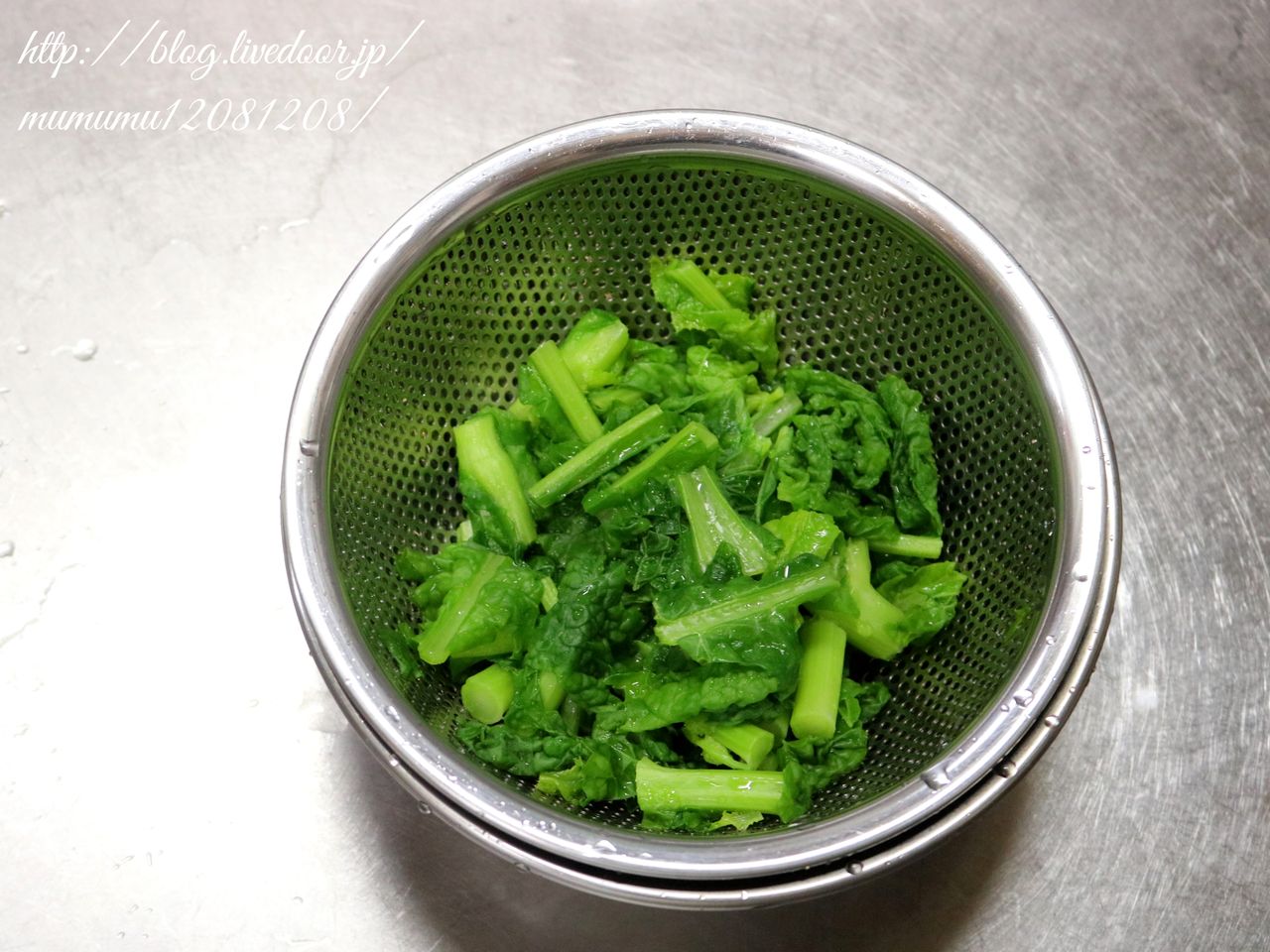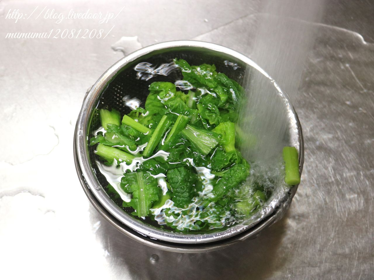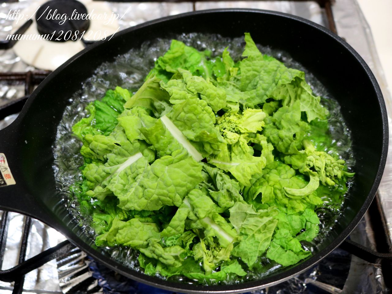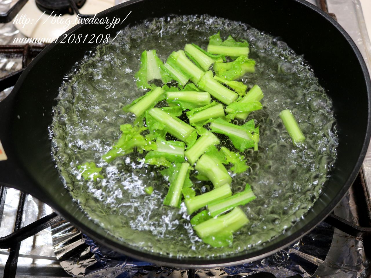 ③鍋にお湯を沸騰させて塩を入れ、菜の花の茎部分を先に入れ→