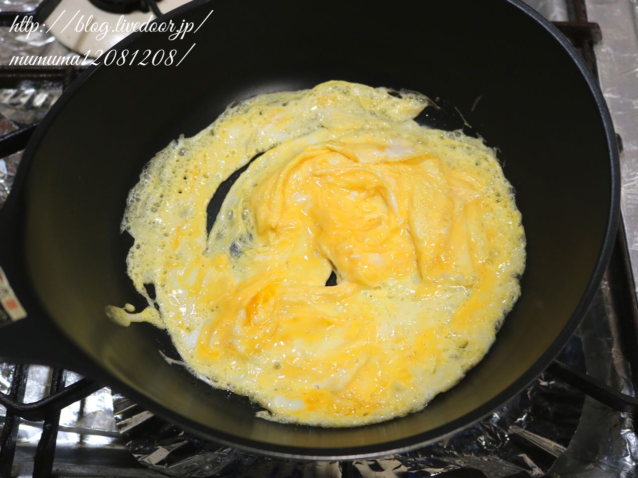 ②フライパンにごま油大さじ1/2を入れて熱し、溶いた卵を入れて炒りたまごを作る。