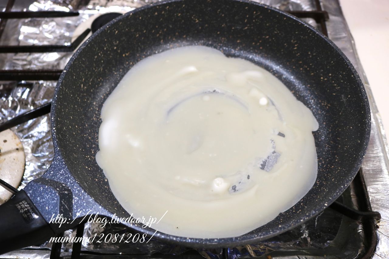 ②テフロン加工のフライパンを熱し、生地を薄く流し入れて弱めの中火で焼く。