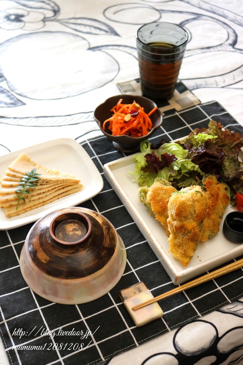 ピーマンの肉詰め?、葉っぱサラダ、キャロットラペ、炙り筍の煮物。
