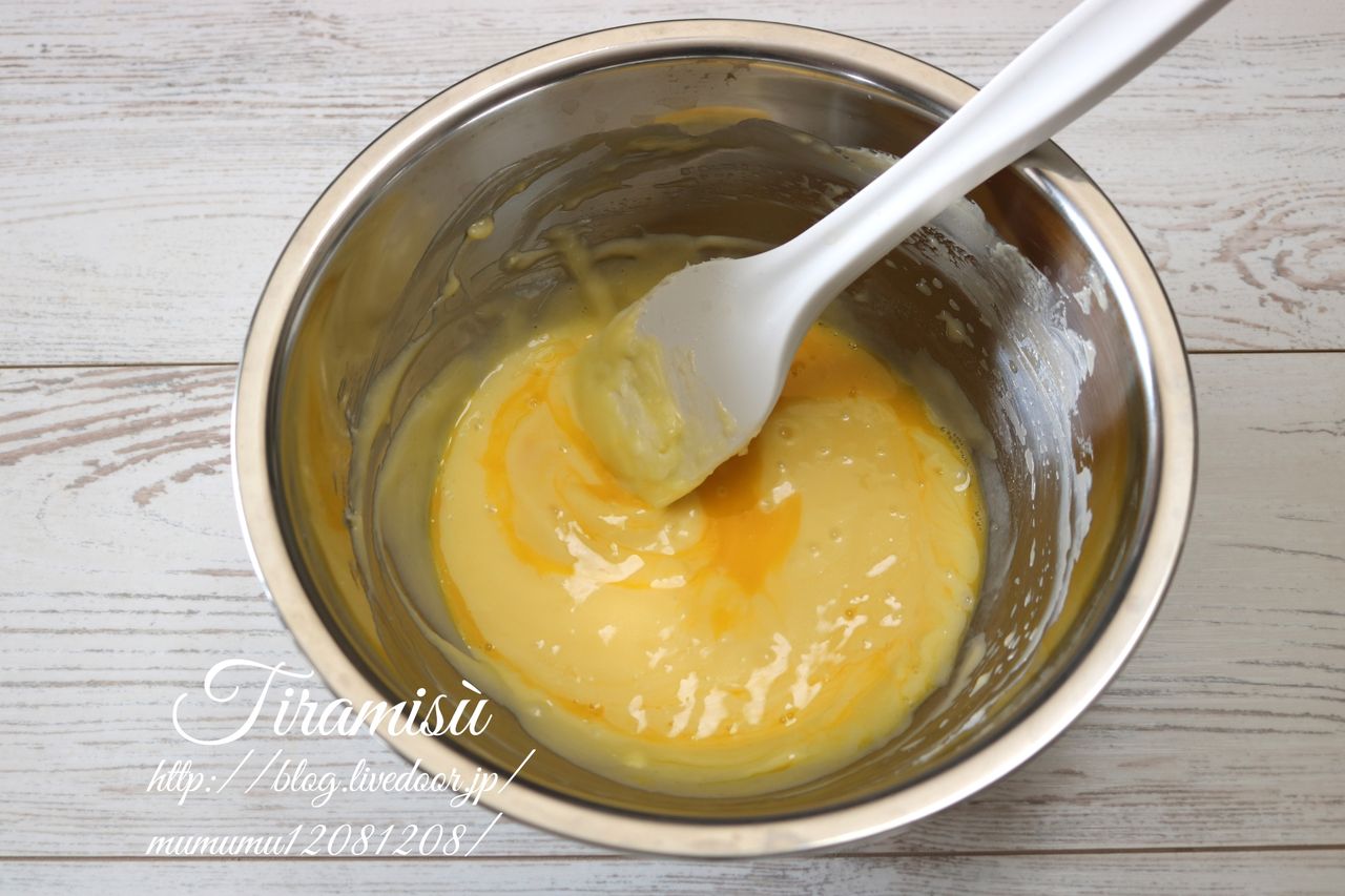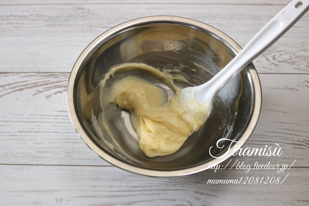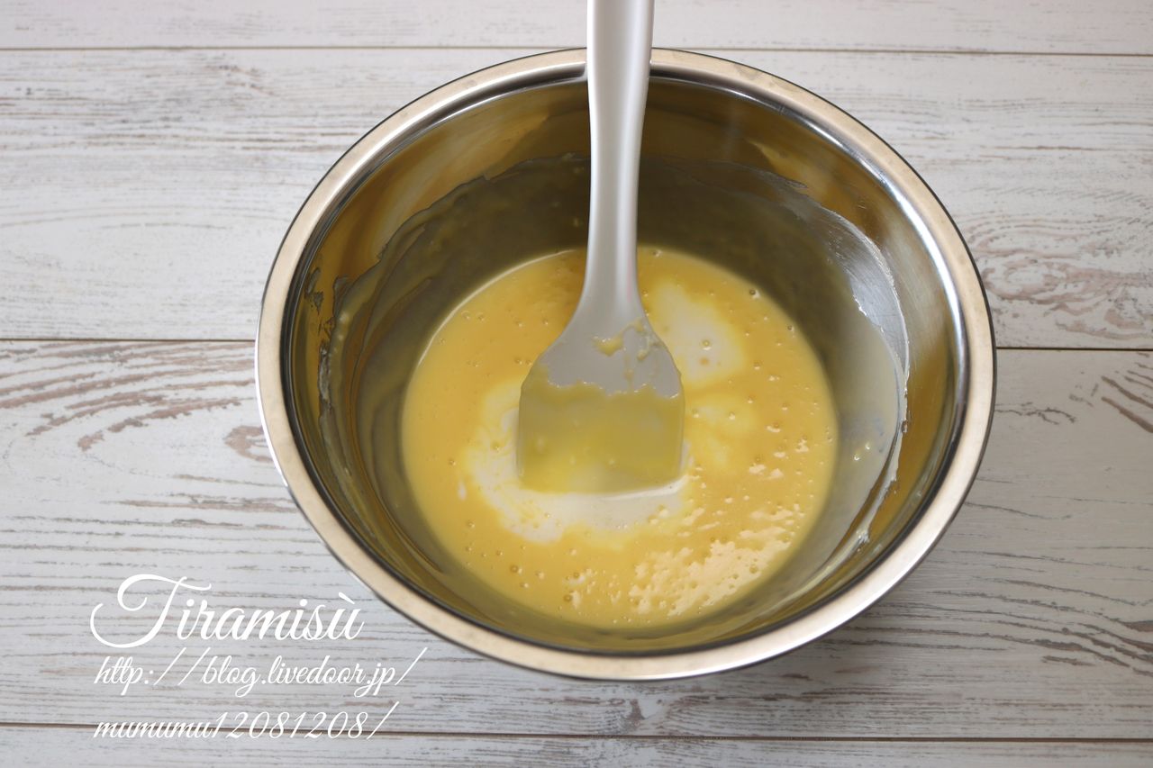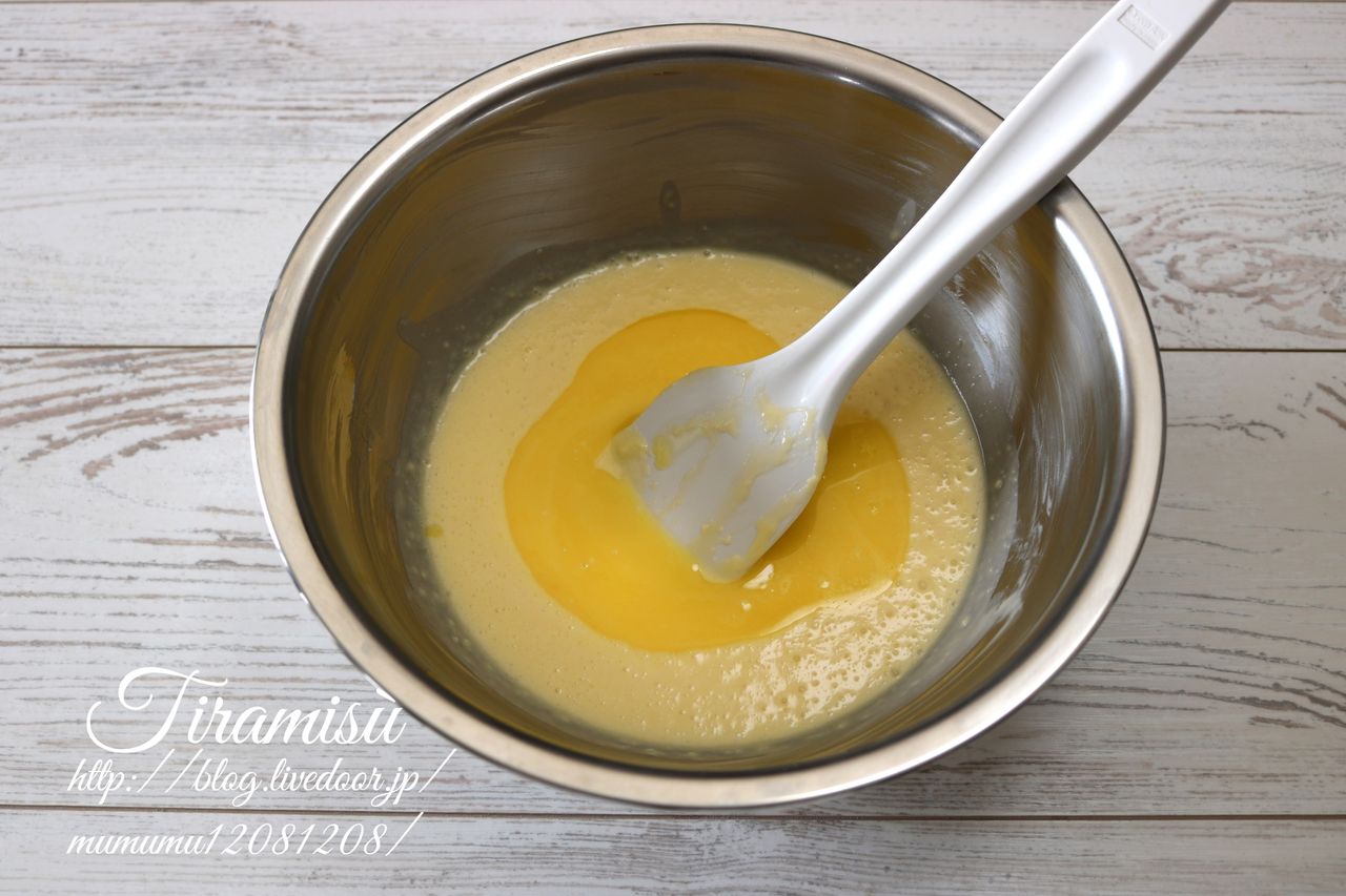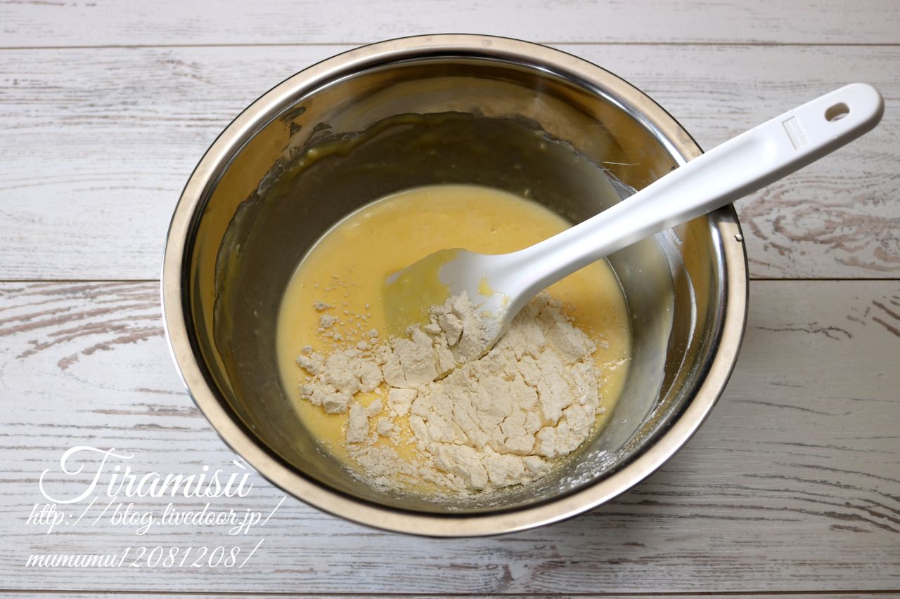 ⑤の工程で振るった薄力粉を入れる訳ですが、