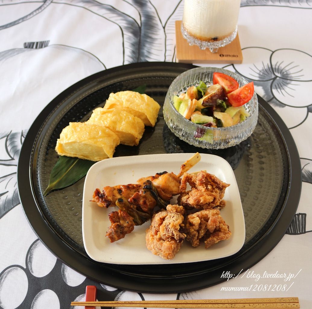 焼き鳥・唐揚げ・湯葉揚げ・サラダ・タピオカミルクティー。