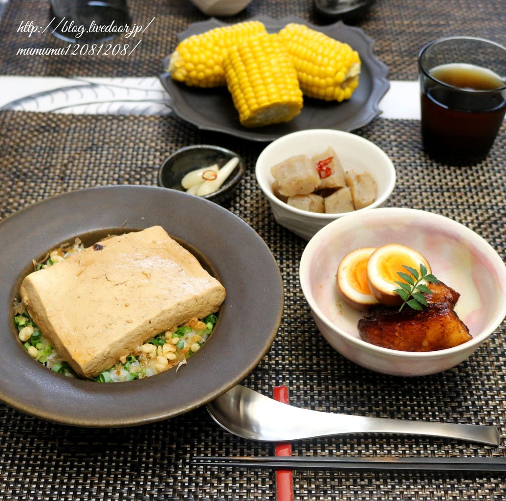 甘辛く炊いた豆腐と一緒に食べるDXとうめしは