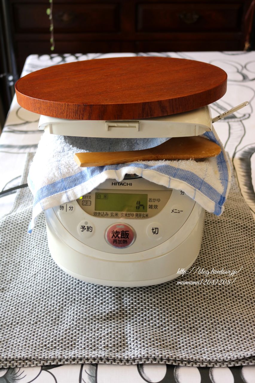 布巾を被せて炊飯器の蓋がピチっと閉まらない様にしゃもじをかませ、