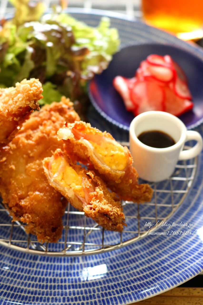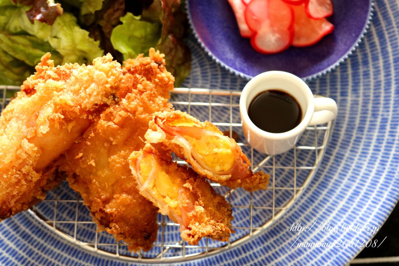 ハムたまごカツ・ねぎの焼き浸し・ラディッシュの甘酢漬け・葉っぱサラダ。