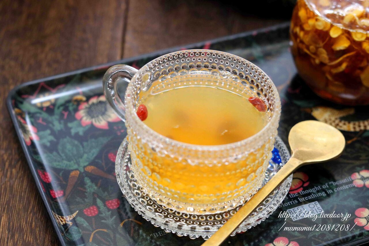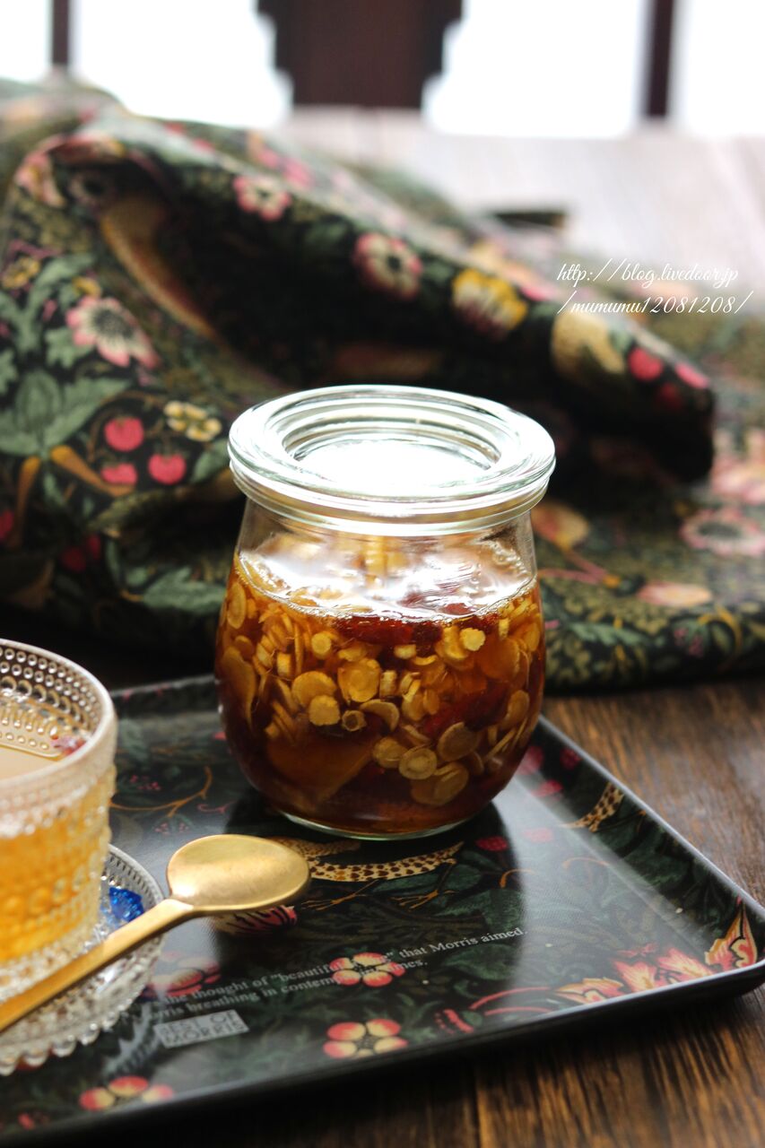 高麗人参と生姜、クコの実をはちみつ漬けにしました。