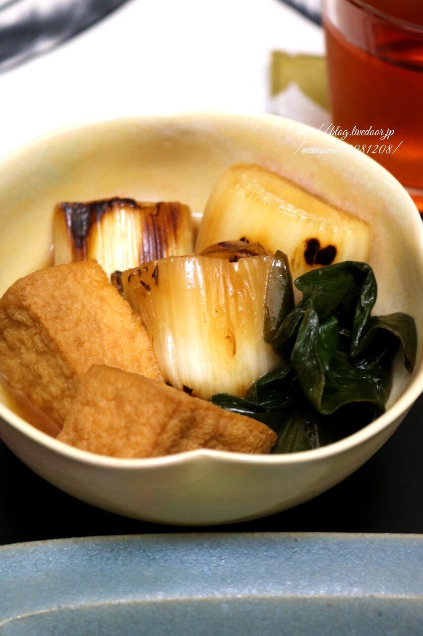 うどん入りねぎ焼き・下仁田ネギと絹揚げの煮物・漬物二種。