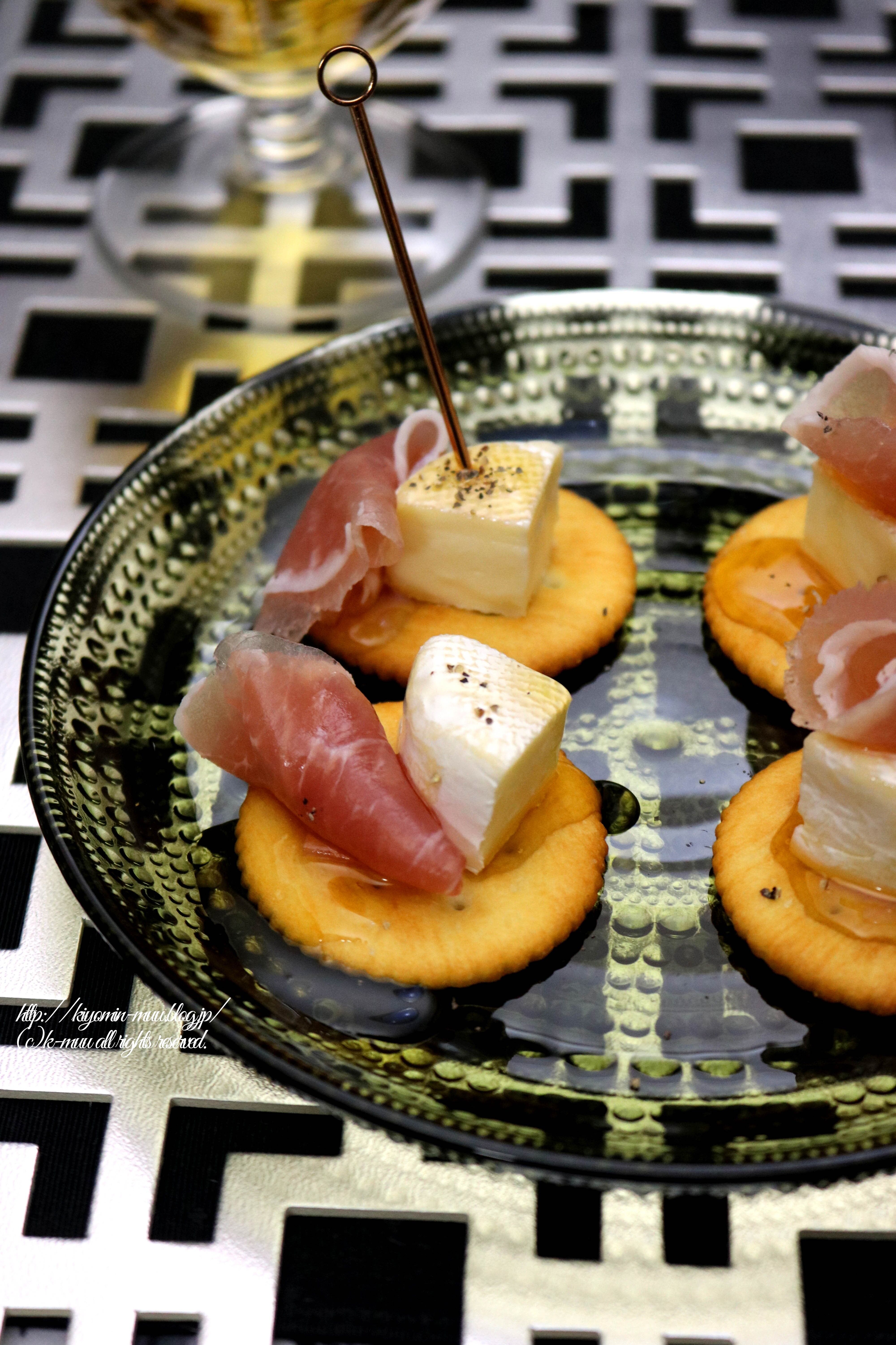リッツの上にカマンベールチーズと生ハム、はちみつをかけておつまみを作った。