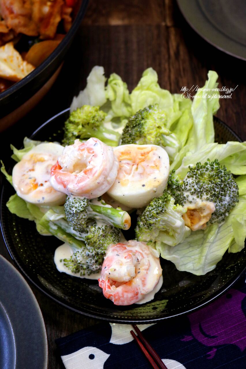 チーズタッカルビ「風」、海老とたまごとブロッコリーのサラダ、写真は無いけど冷奴。