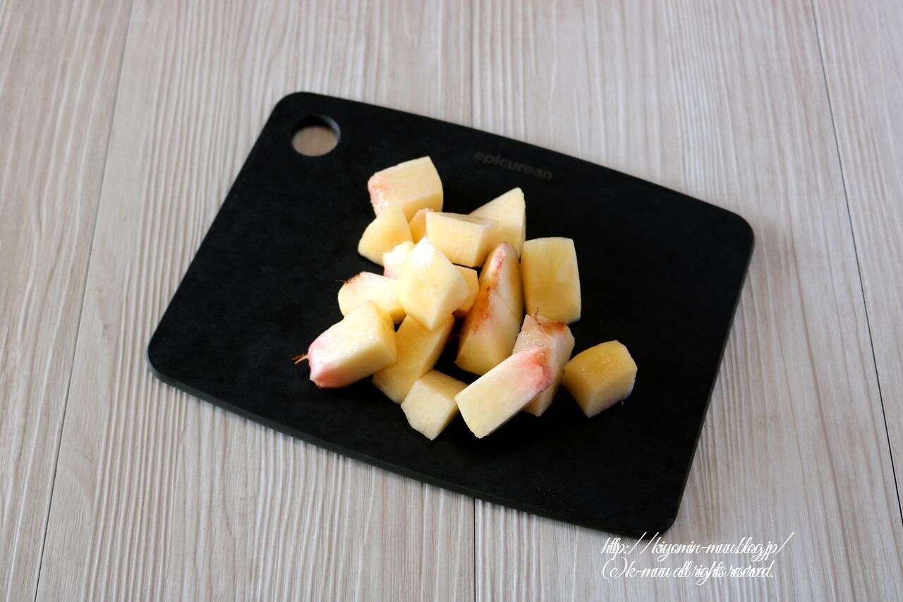①桃は一口大に切る。