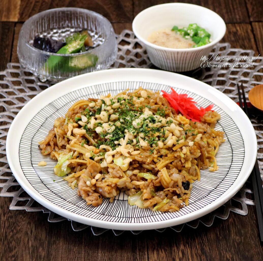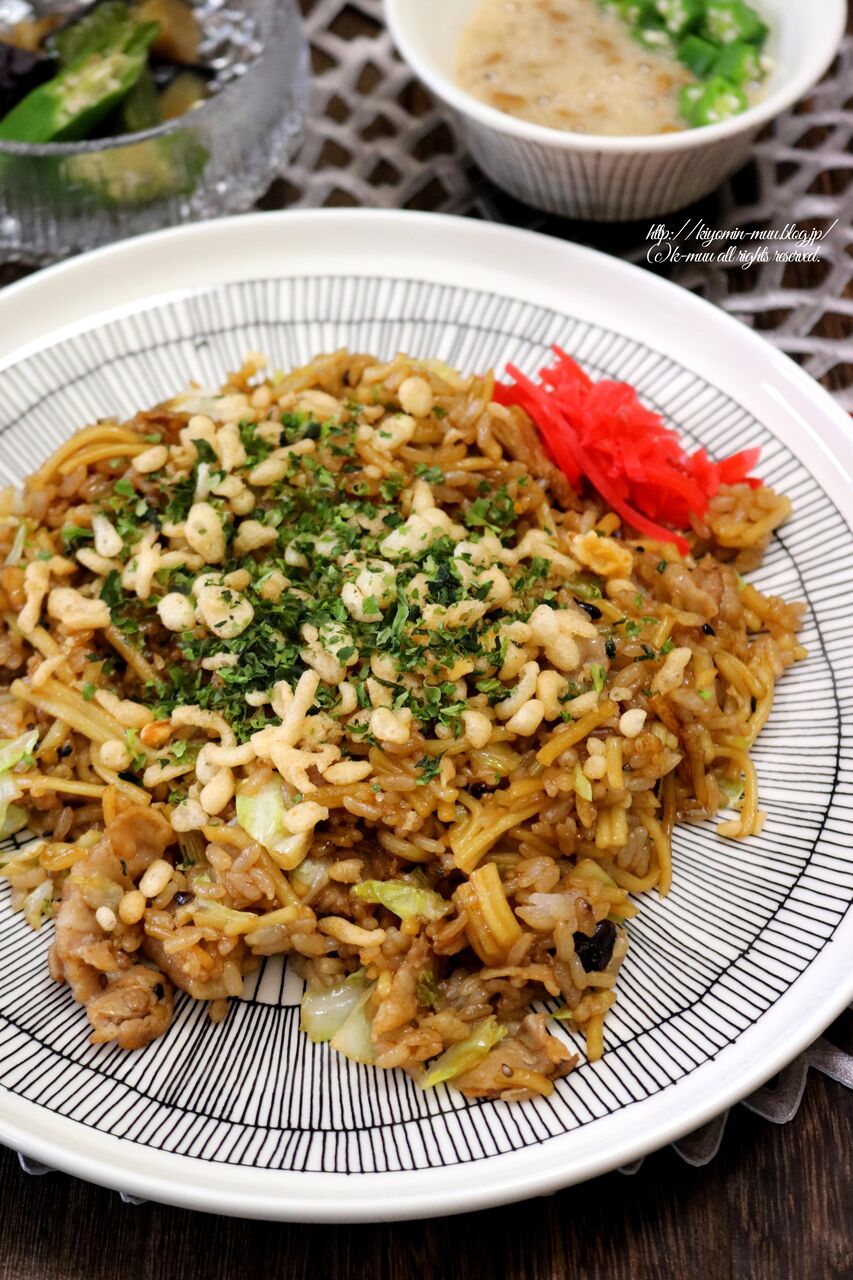 そばめし・オクラ納豆・野菜の揚げ浸し。