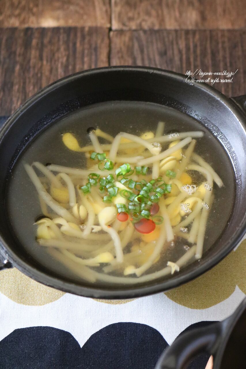 ビビンバ丼、揚げないフライドポテト、豆もやしのピリ辛中華スープ。
