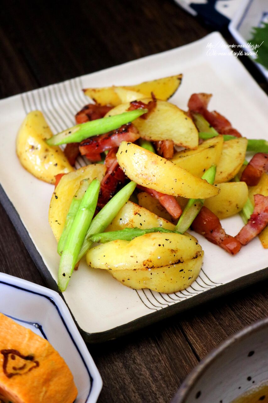牛皿、ネギ入り卵焼き、アスパラベーコンじゃがいも入り。
