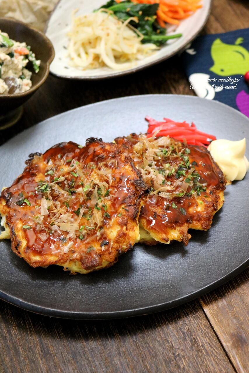 面倒な時のお好み焼きだよ。と豆腐入りのヘルシーなミニお好み焼き。