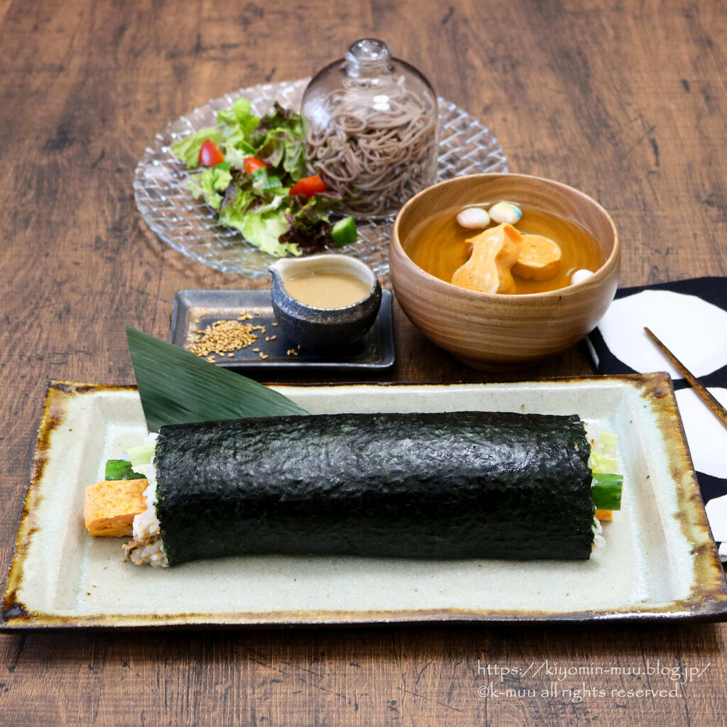 恵方巻・ぶっかけサラダそば、ごまたれ・我が家のお吸い物。