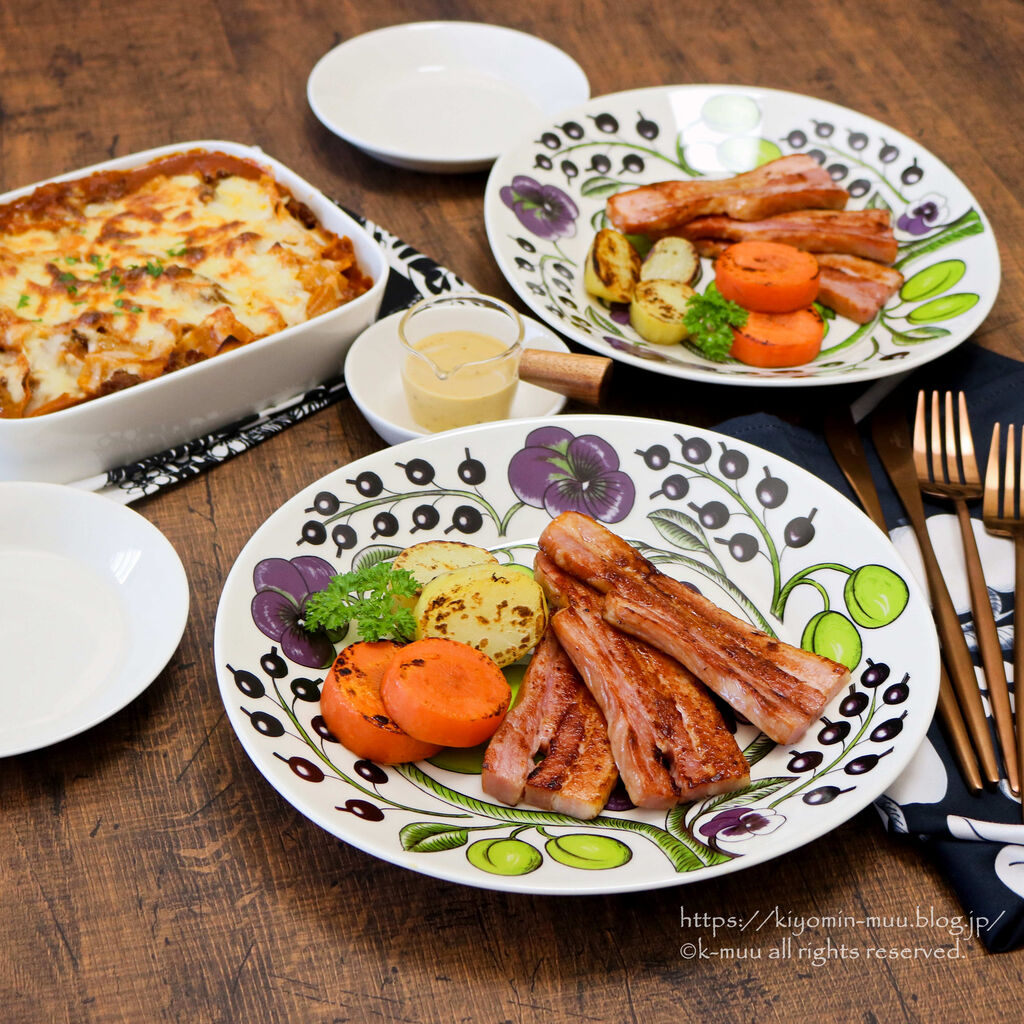 私にはハムに見えた、ハム?ステーキ、焼き野菜、ラザニア。