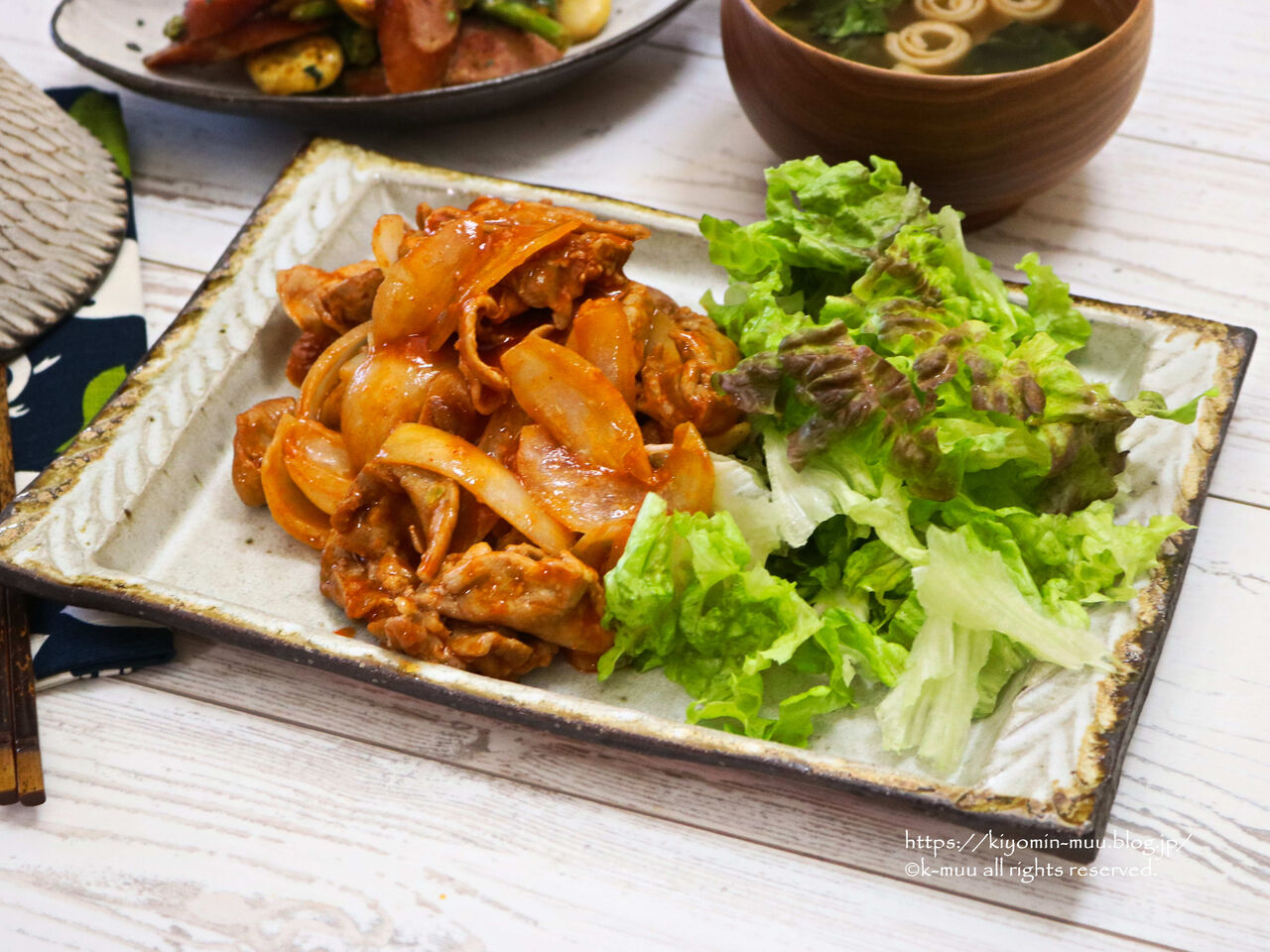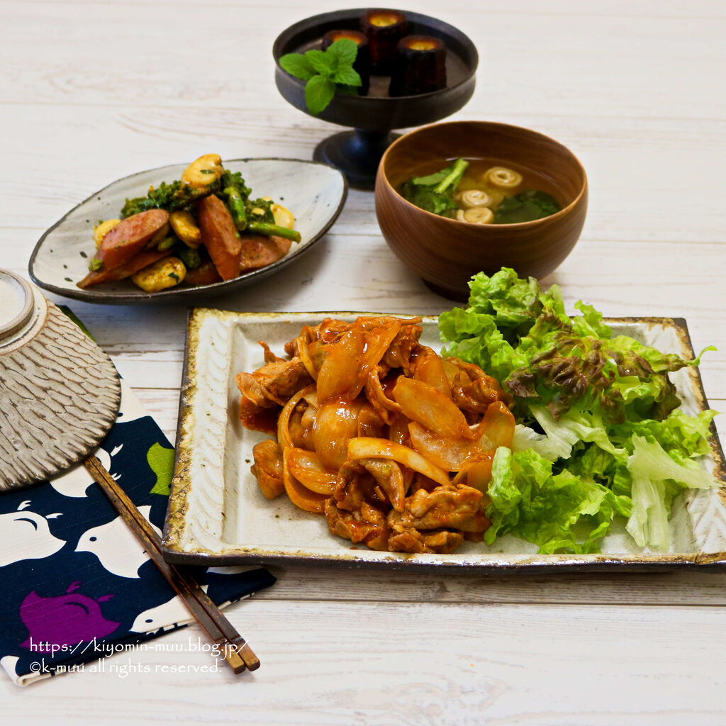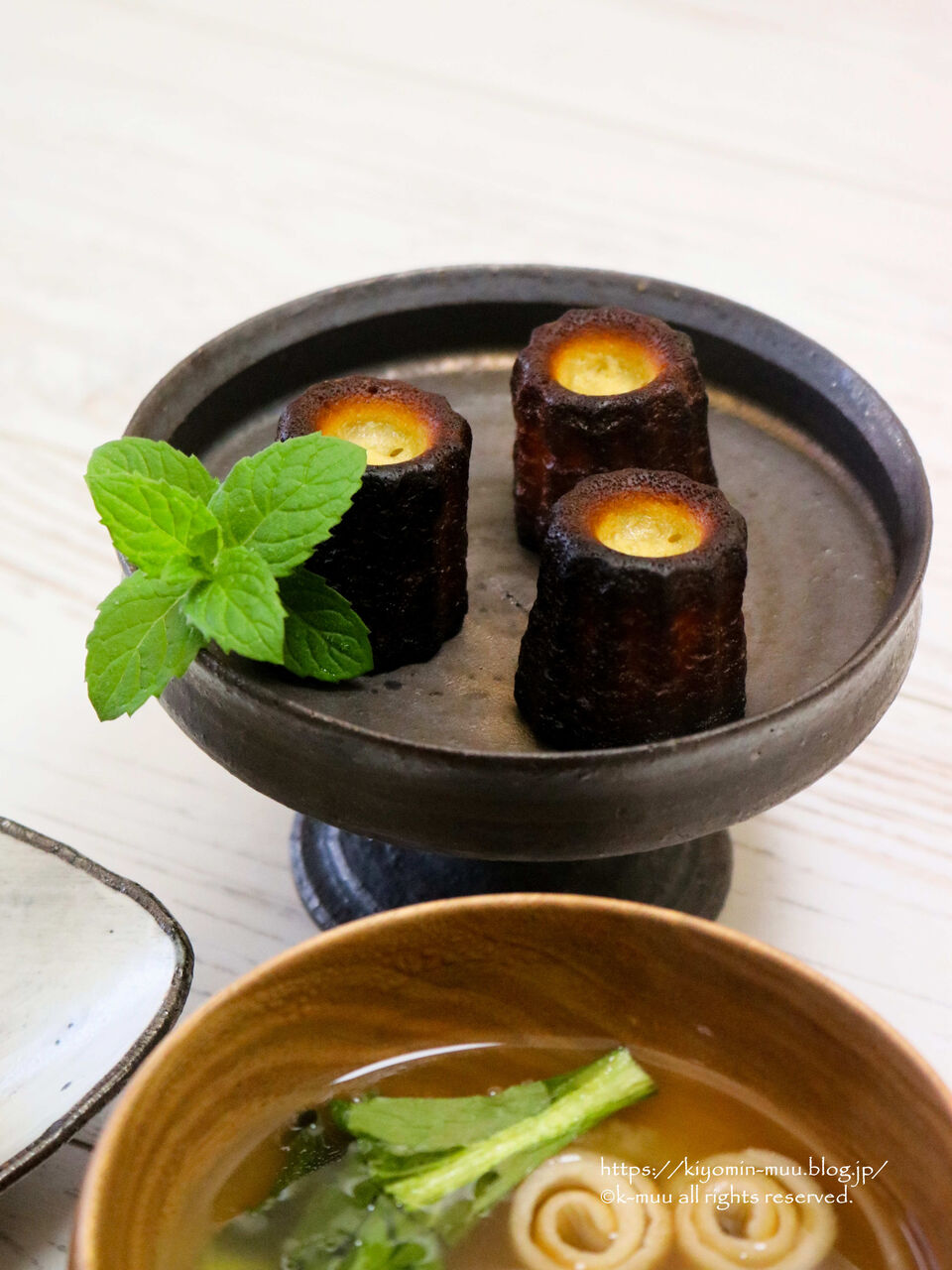 ヤンニョムポーク、菜の花とジョンソンヴィルのハニーマスタード炒め、渦巻き麩と小松菜の味噌汁、カヌレ。