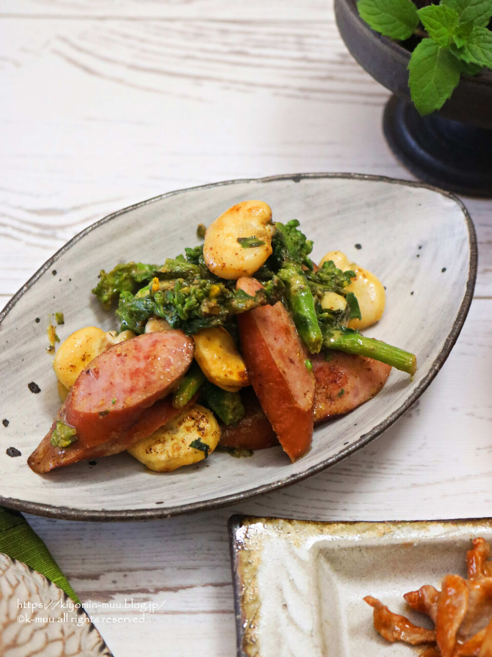 それを使って菜の花とジョンソンヴィルのハニーマスタード炒め、そら豆入り。