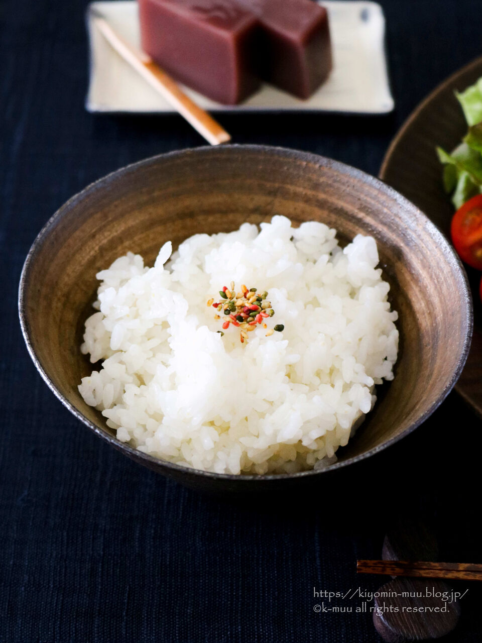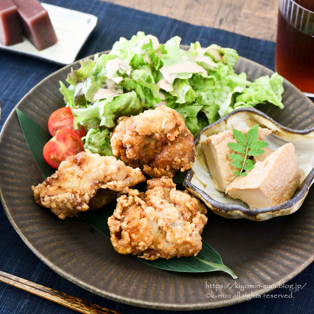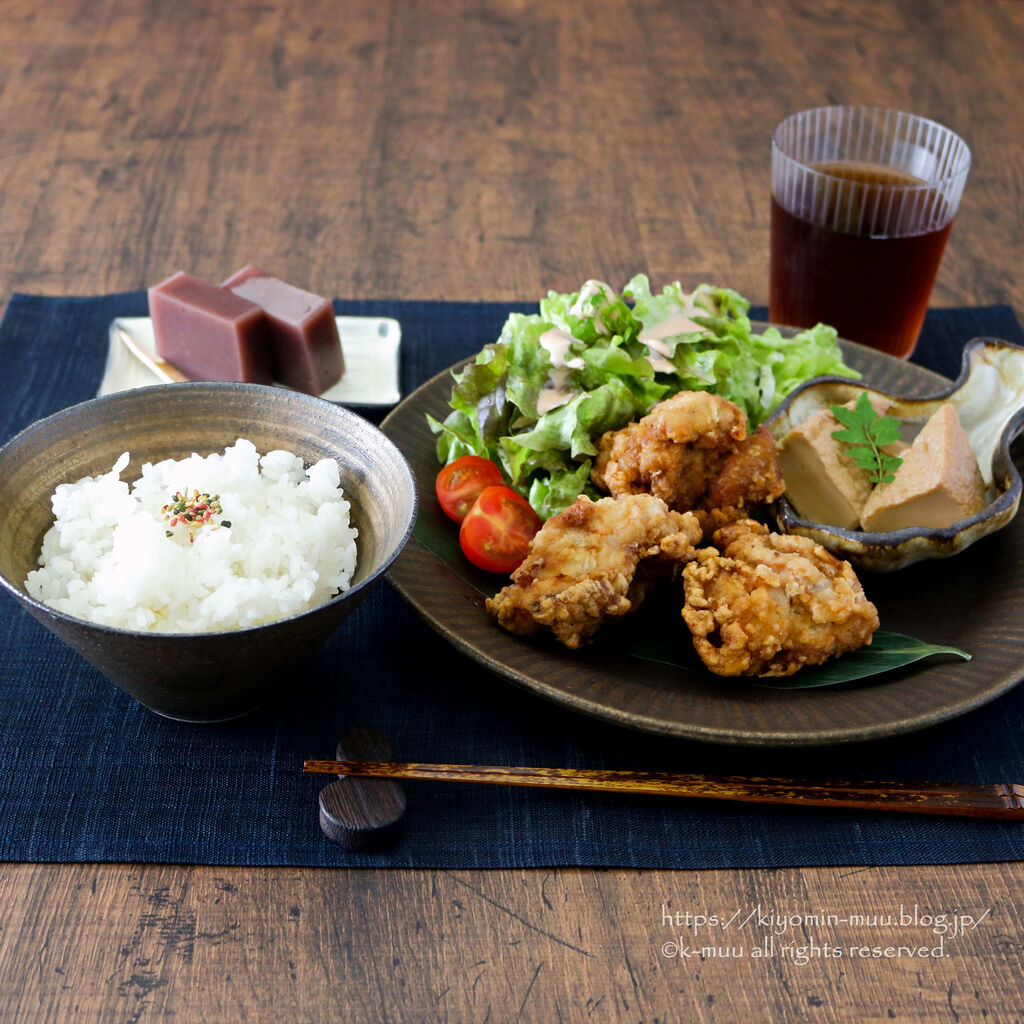 唐揚げ、厚揚げの旨煮、サラダ、ご飯、あがり羊羹。