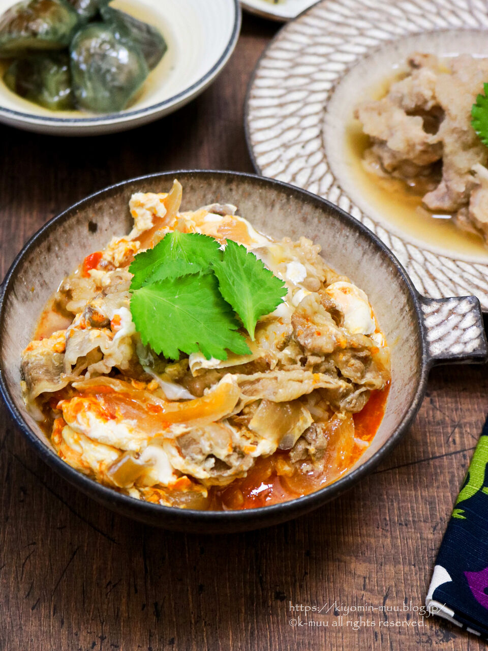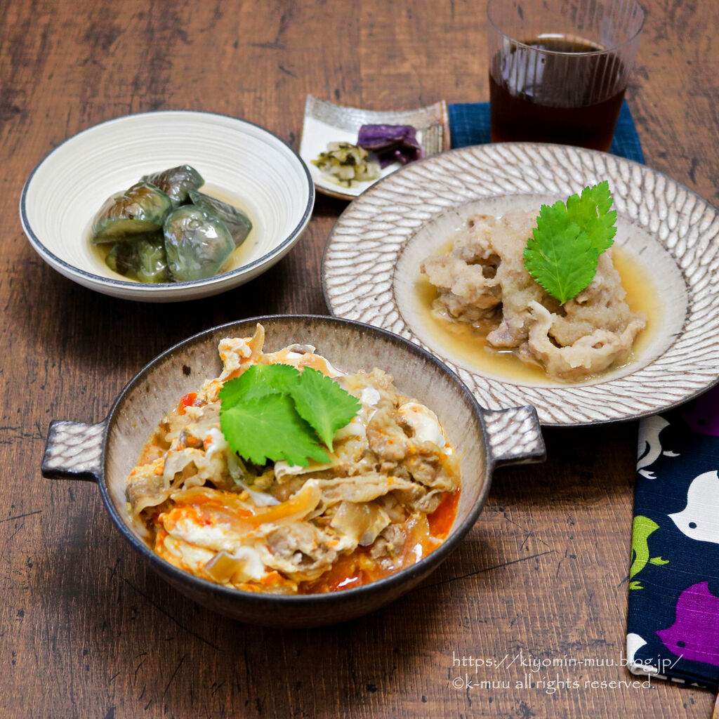 牛とじ丼・豚肉のおろし煮・色が抜けた茄子の揚げ浸し・漬物。