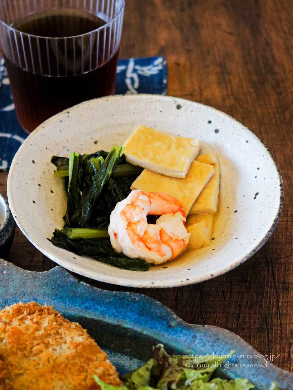 メンチカツ・葉っぱサラダ・小松菜と海老の旨煮・田舎煮。