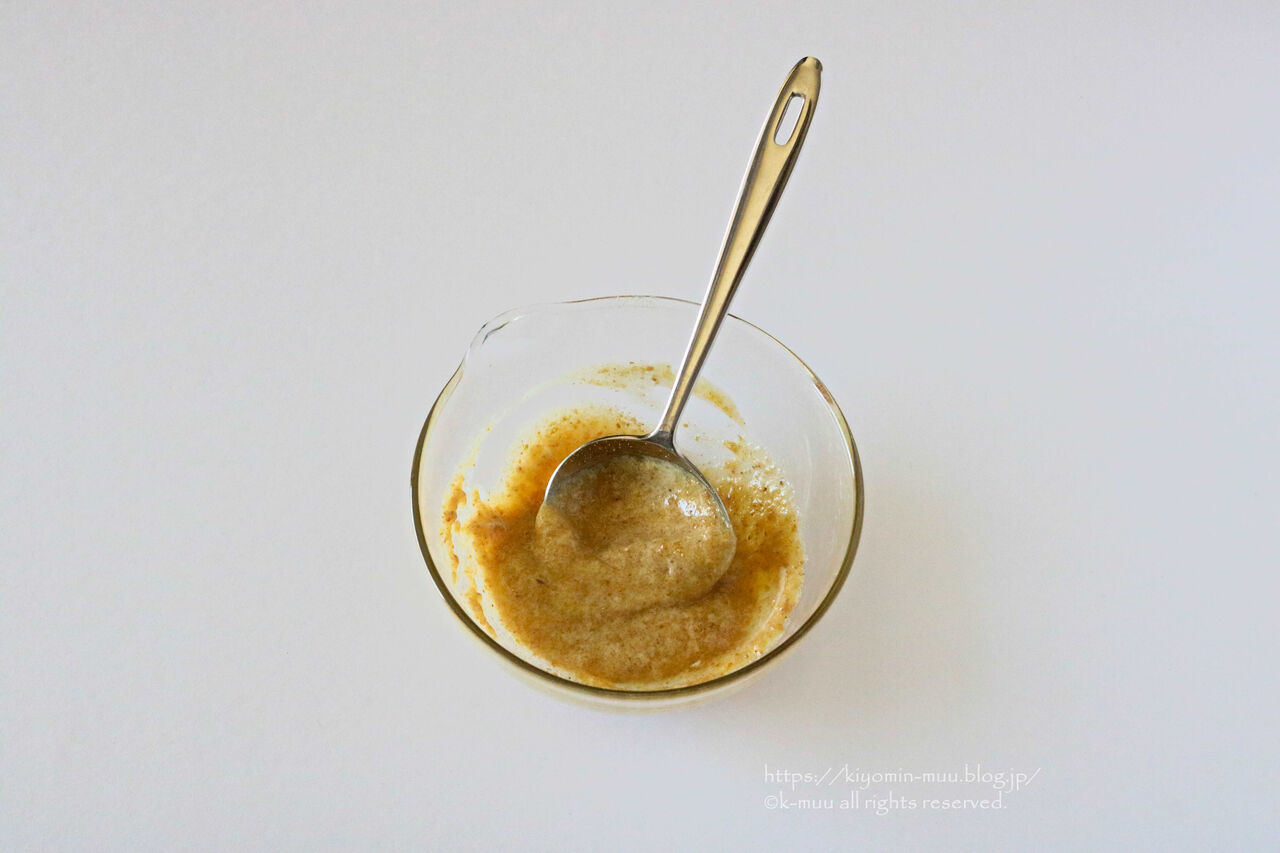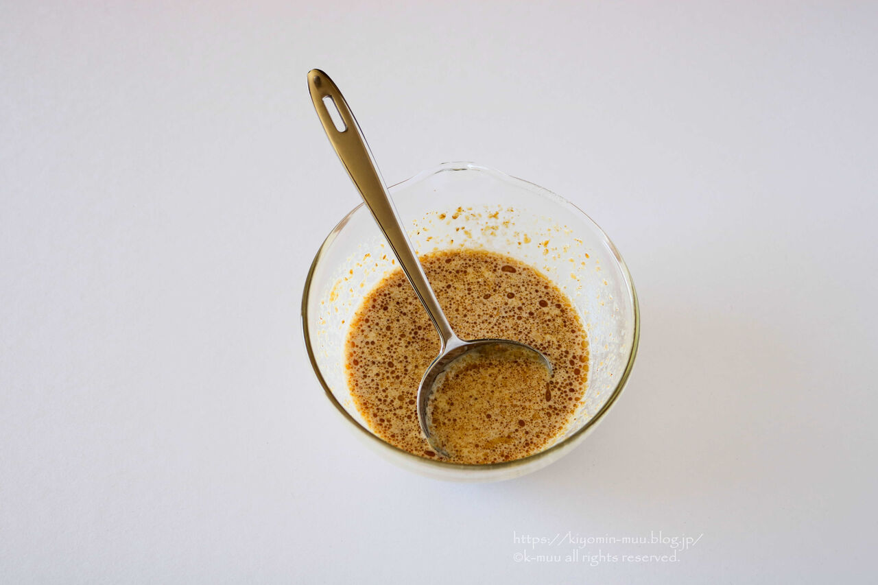 ①ボウルにマヨネーズ、すりごま、砂糖を入れて混ぜる。