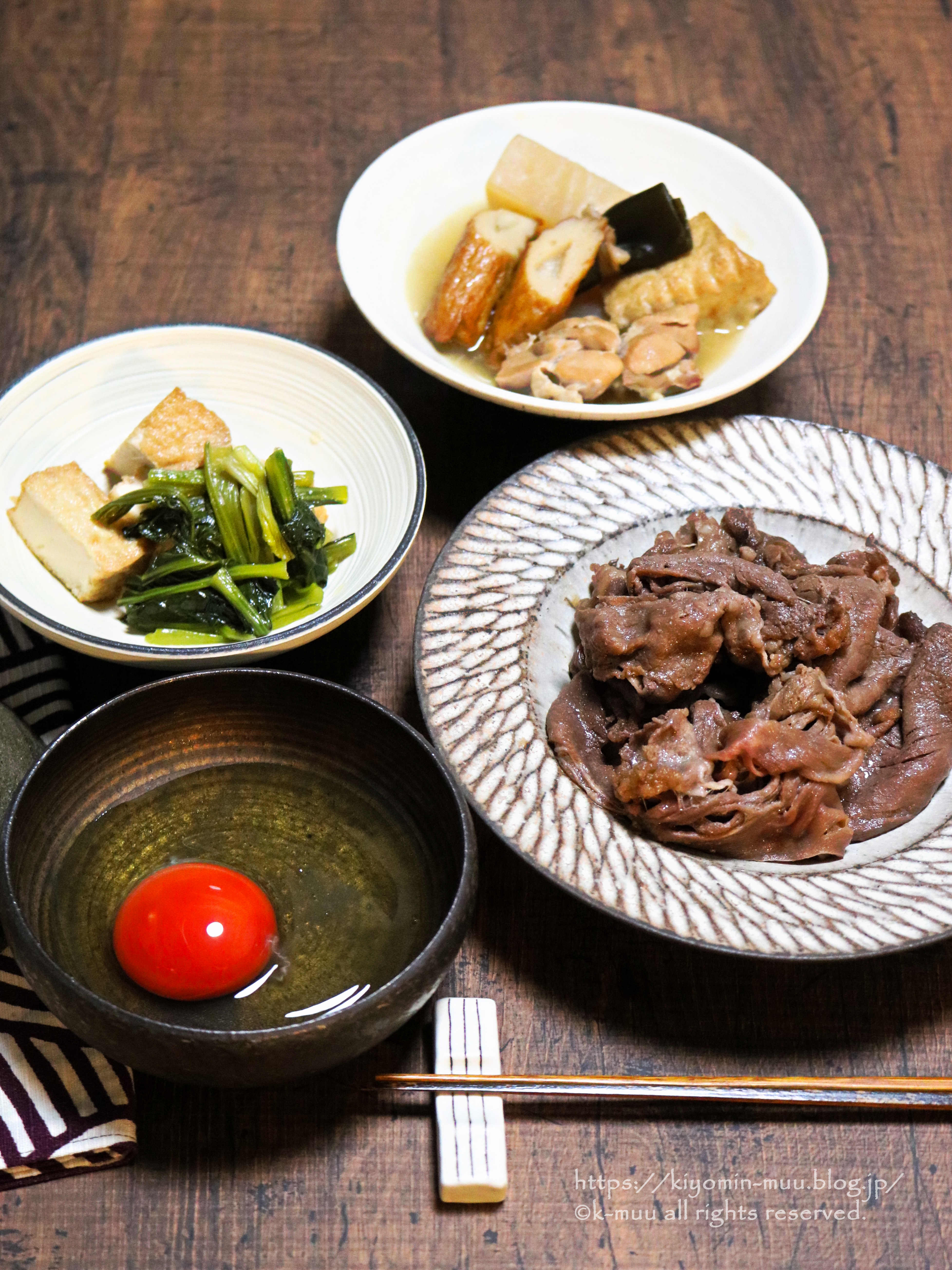 牛肉のすき焼き風・おでん風・厚揚げと小松菜の煮びたし。