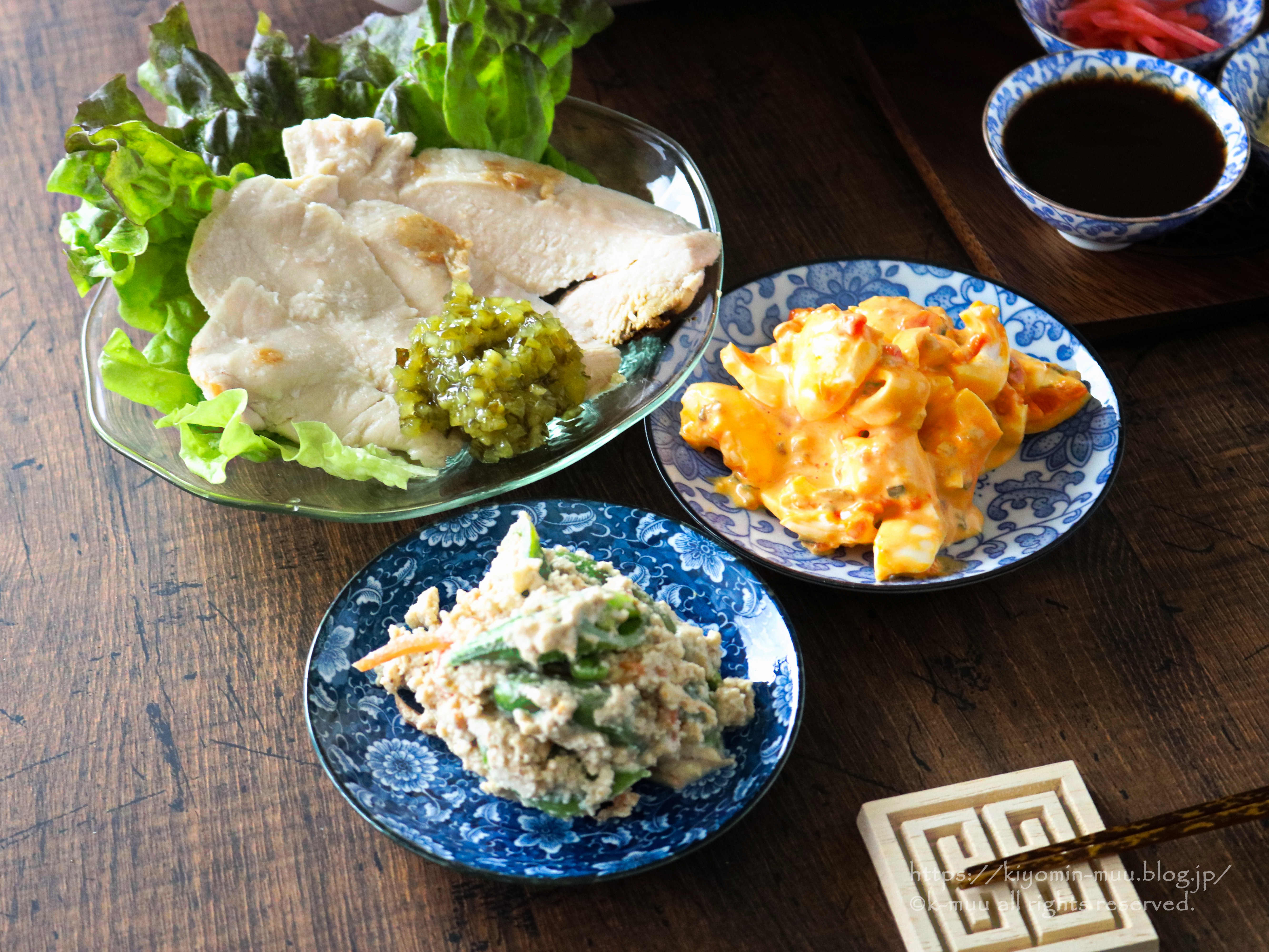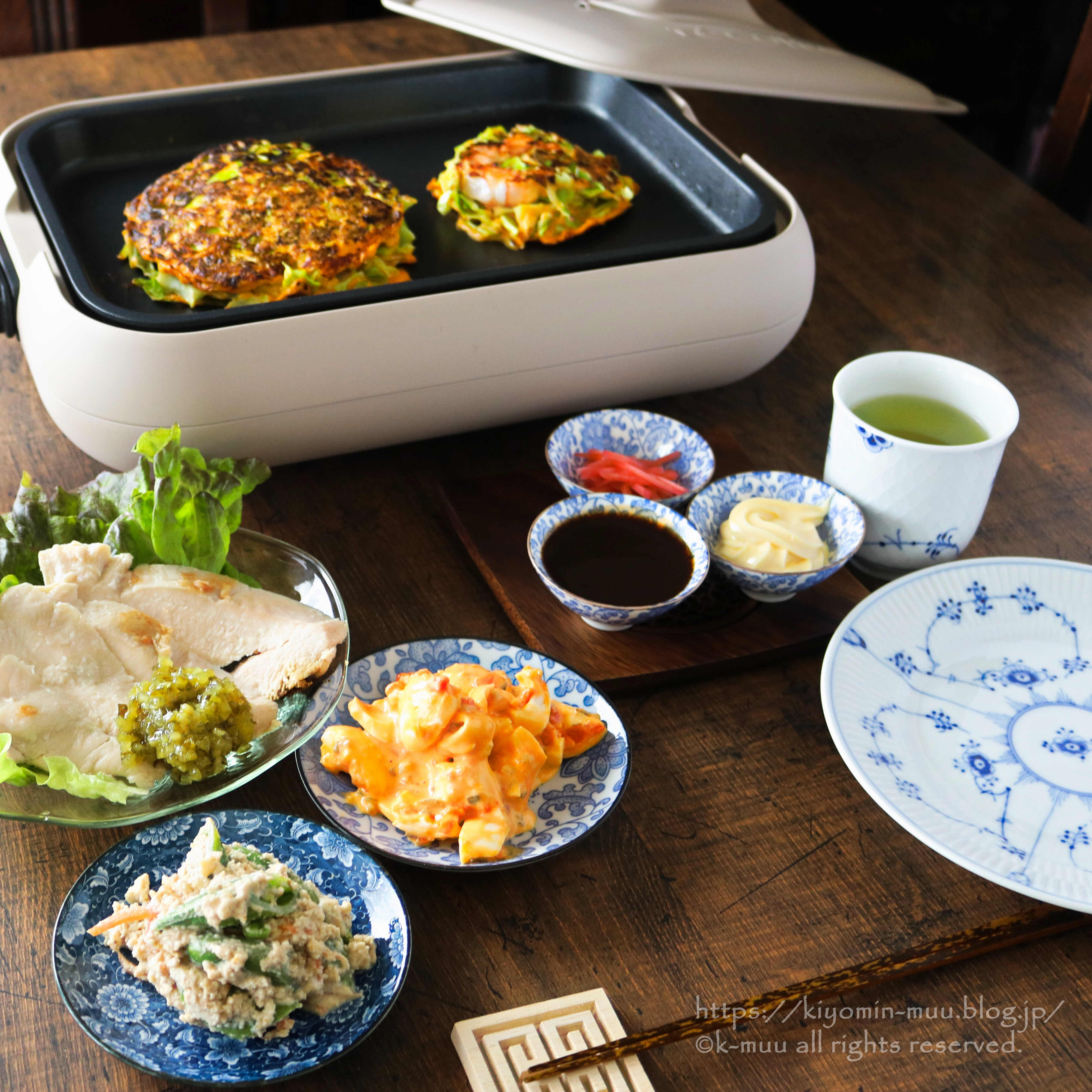 お好み焼き・たまごサラダ・スナップエンドウの白和え・サラダチキンwithピクルス。