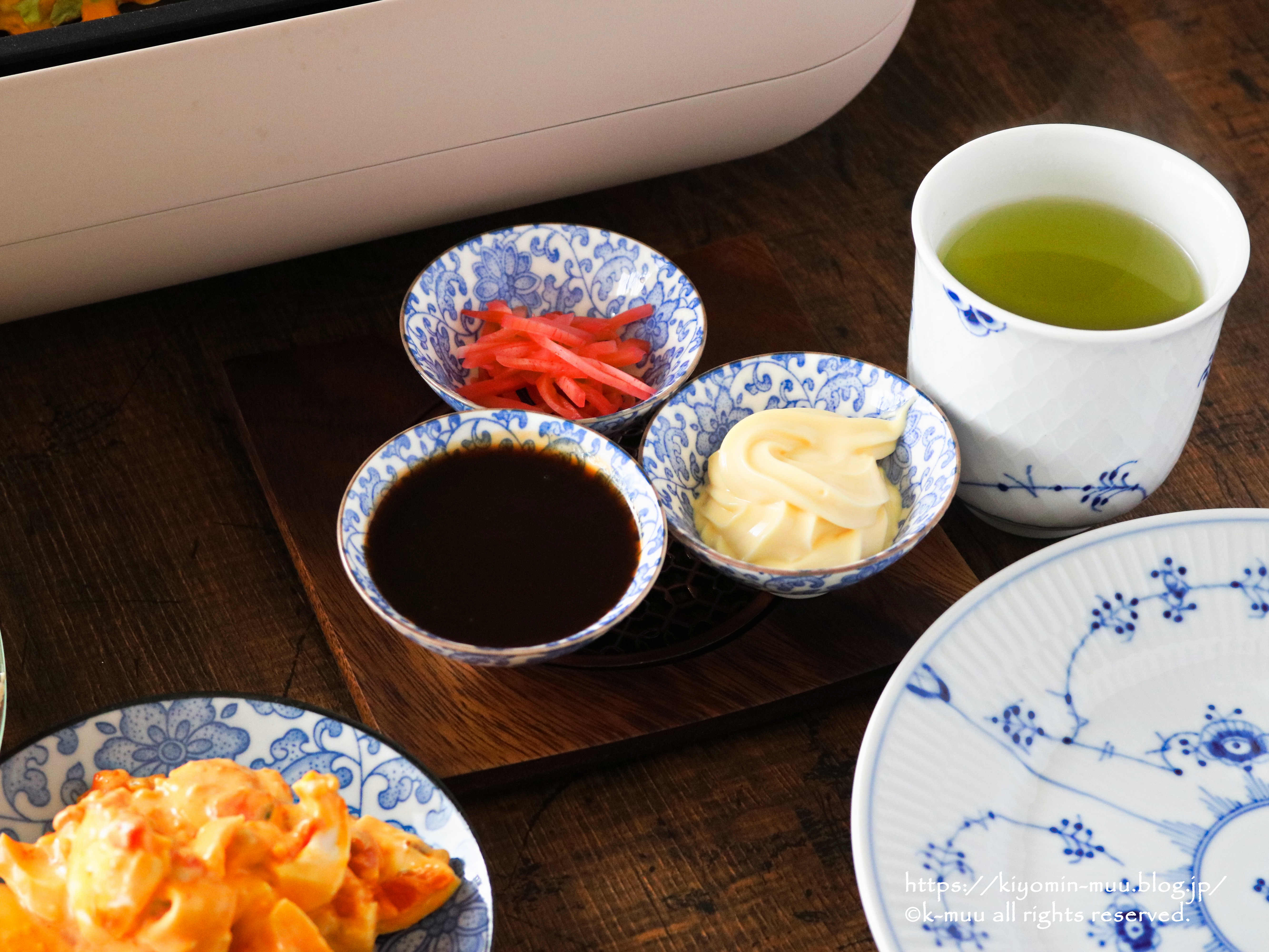 お好み焼きソースとマヨネーズ、紅ショウガを添えて。