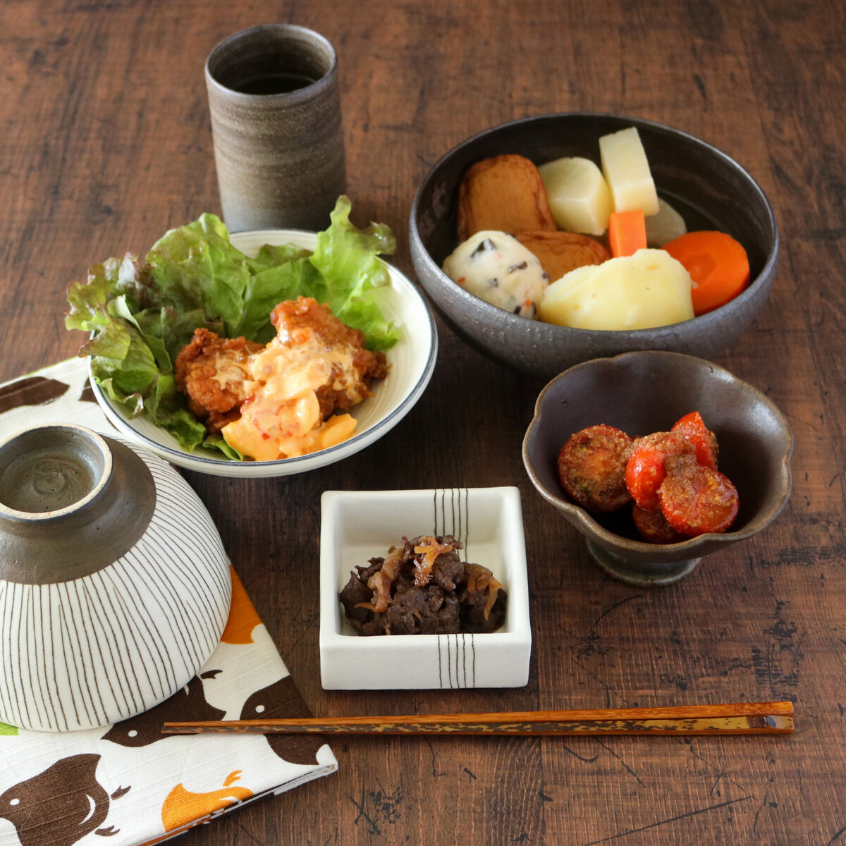 肉無しおでん・鶏南蛮・牛肉のしぐれ煮・トマトのごま和え。