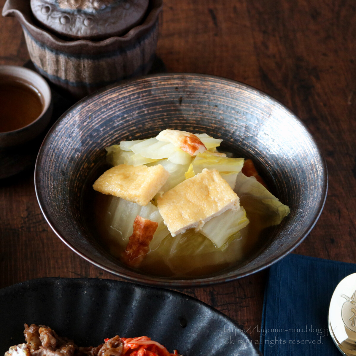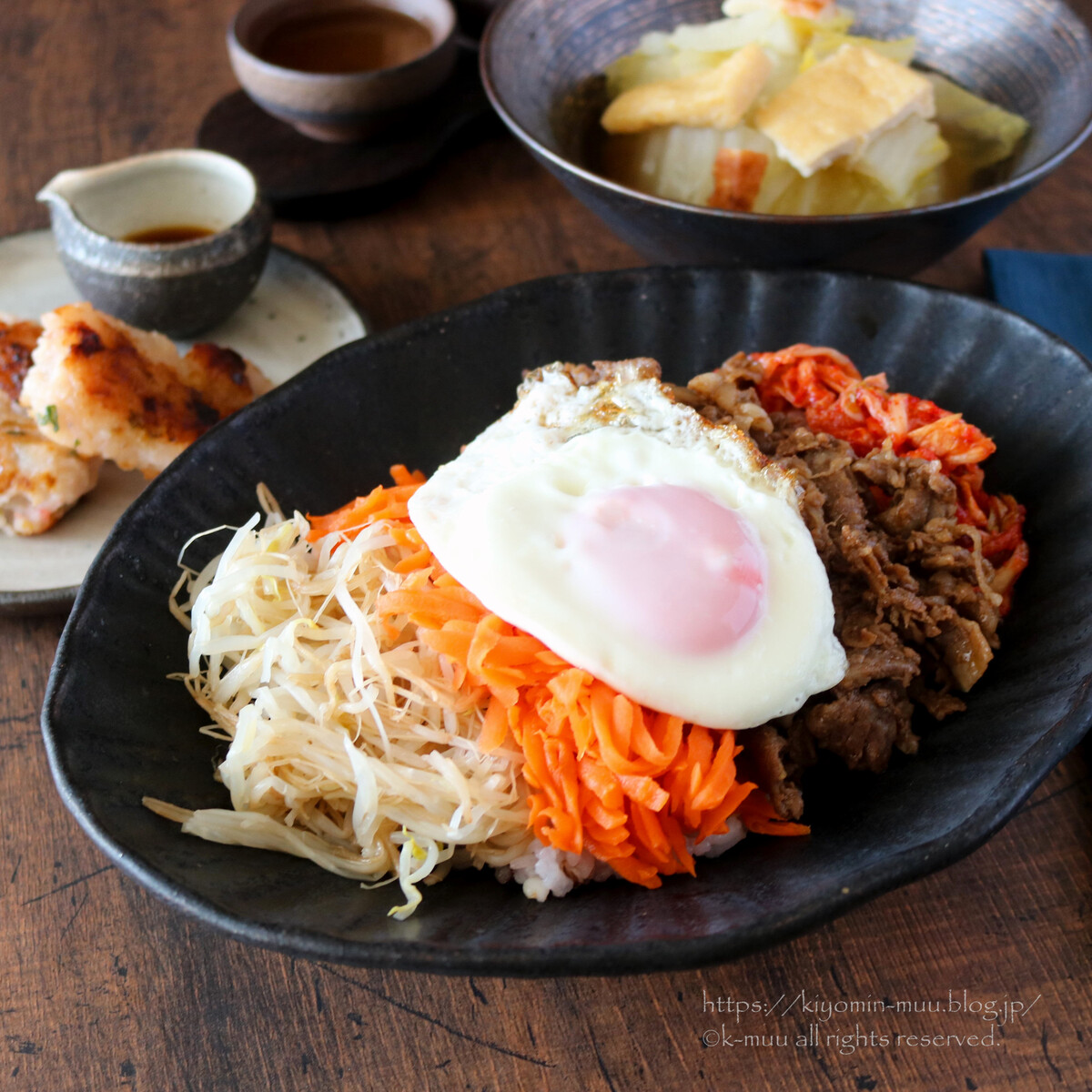 ビビンバ・白菜とちくわ、揚げの煮浸し、ちゃんと蒸して焼いた大根餅