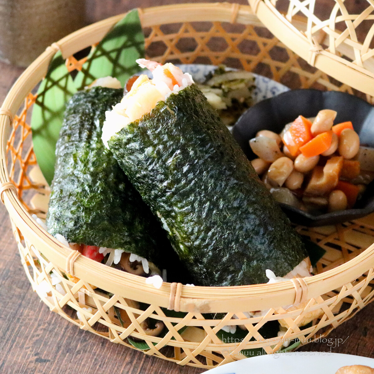 たまご、かにかま、きゅうり、かいわれ大根、椎茸の甘煮、ちくわの磯部焼き、すぐき