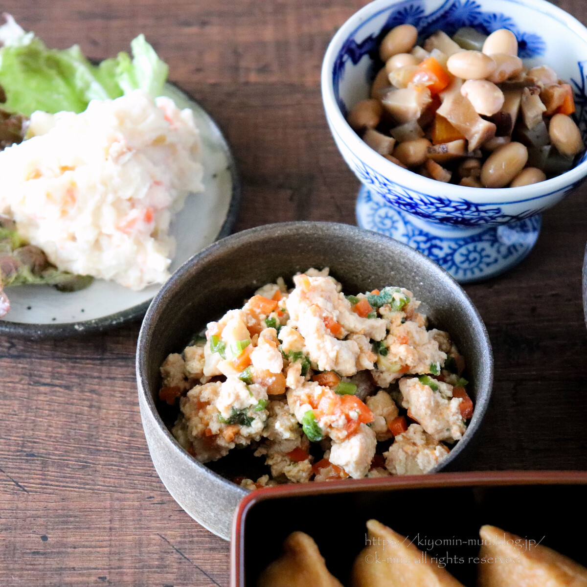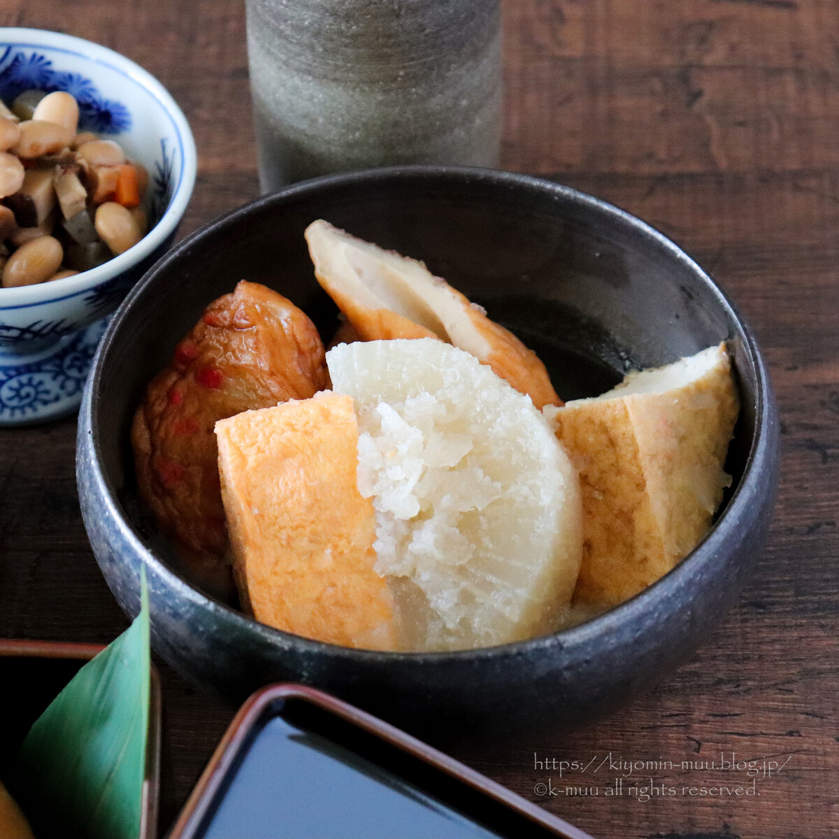 作り方が雑だった?耳付きいなり寿司、みぞれおでん、五目豆、炒り豆腐、ポテトサラダ。