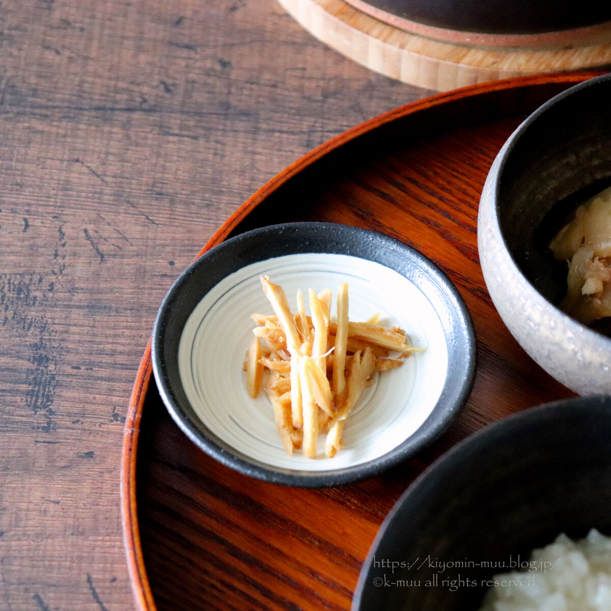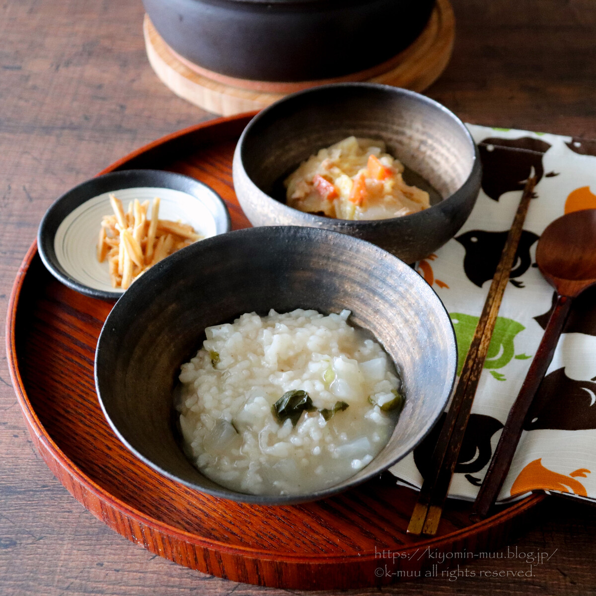 スズシロ粥、白菜の炊いたん、生姜の味噌漬け。